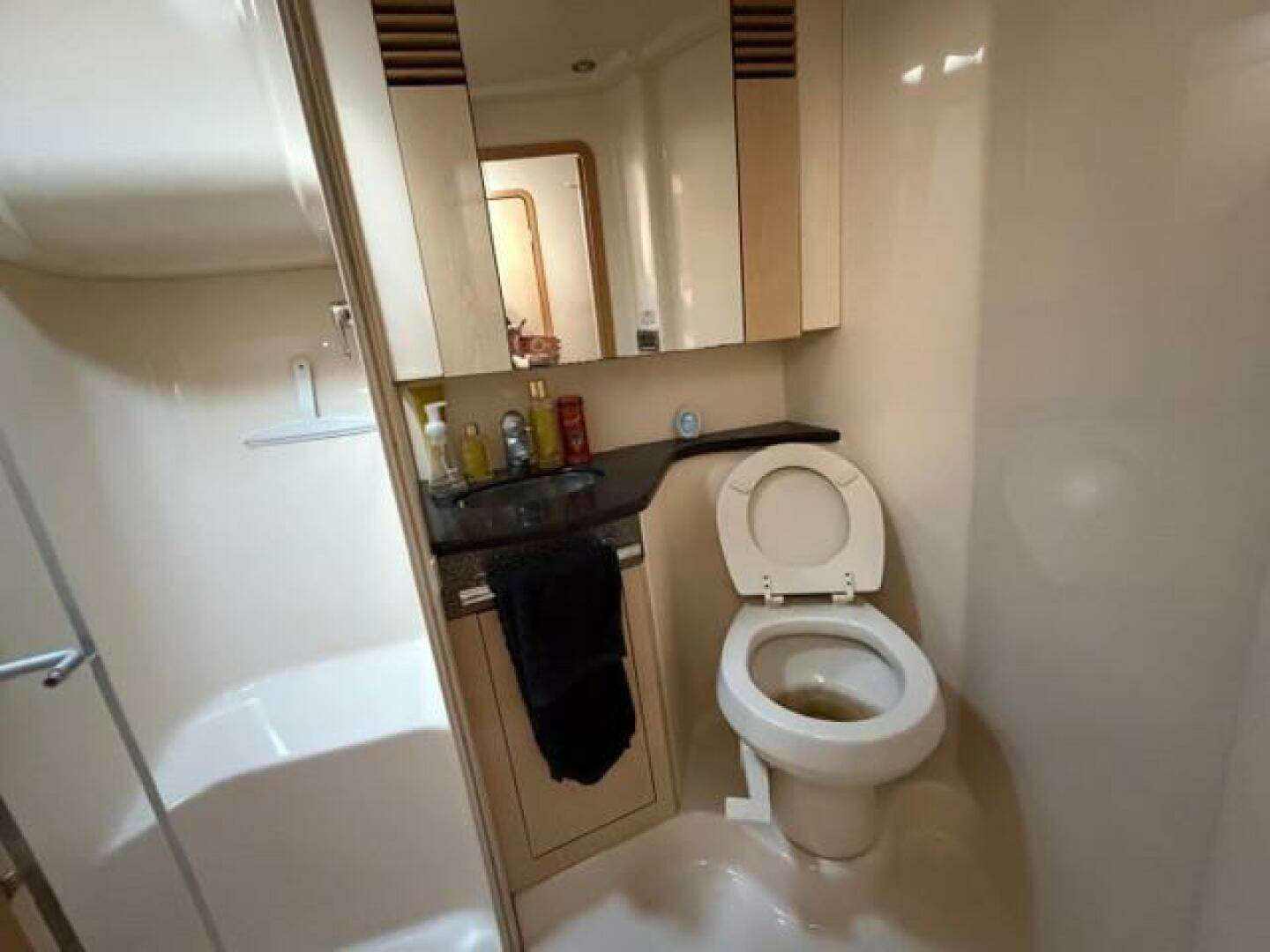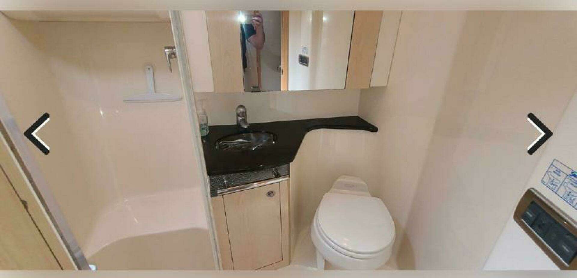The mid berth to port sleeps two, as does the master forward, and both the guest and master heads have vacu-flush toilets, vanity sinks, and shower stalls