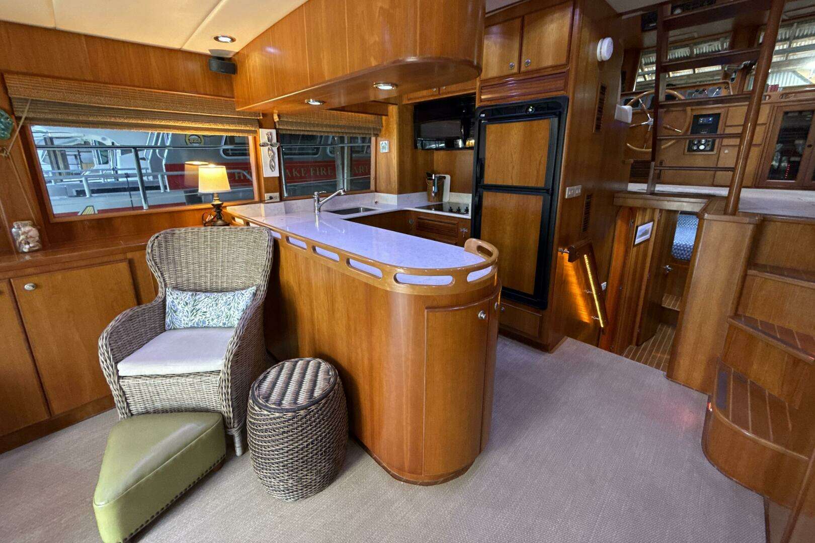 Large, cozy pilothouse has opening doors to the side decks both port and starboard and large windows for excellent visibility. The L-shaped settee with table is aft to port and doubles as an extra bed when needed. Aft of the helm are stairs to the flybridge.