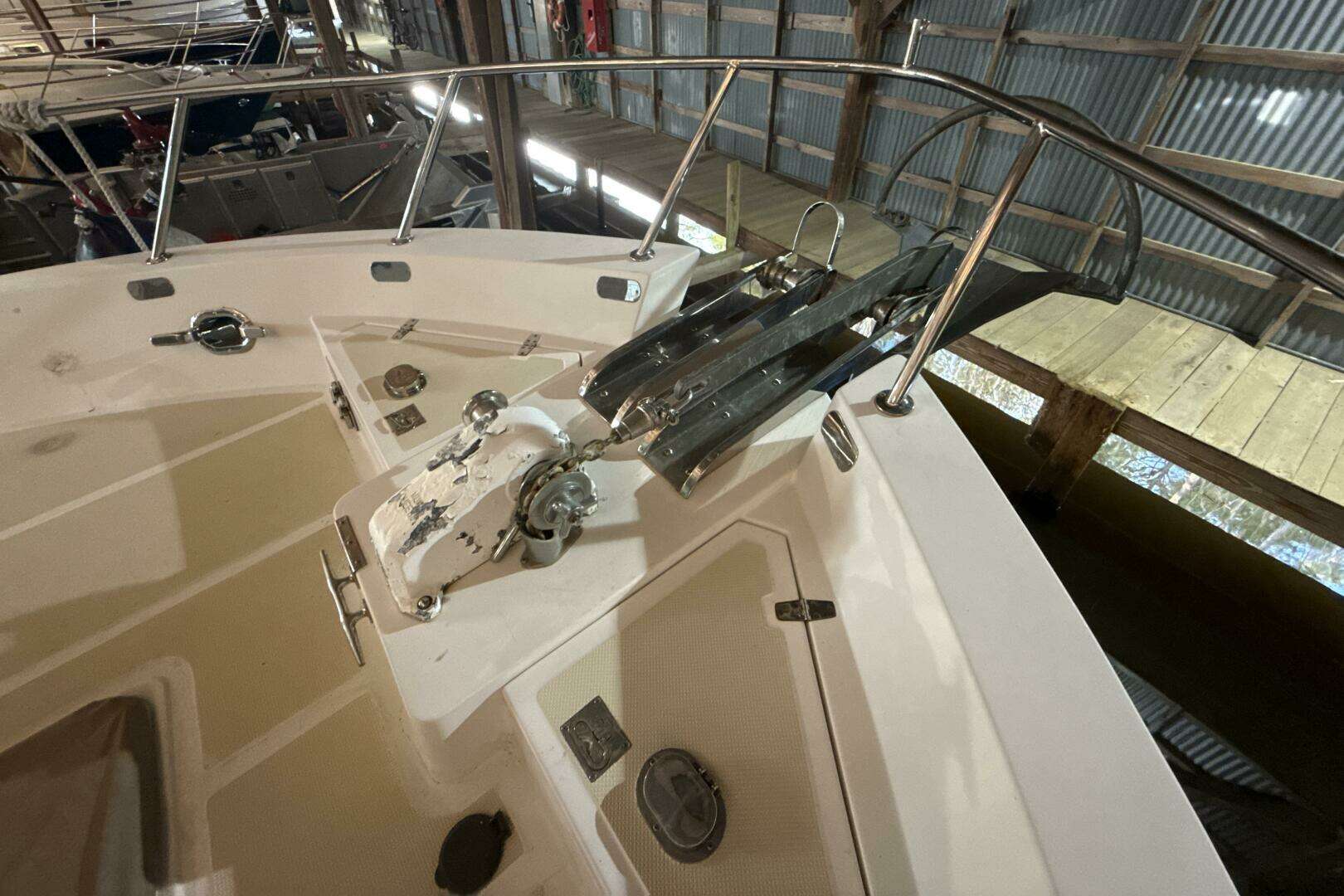 The Flybridge well equipped helm to port features two captain’s chairs, a single seat to port of the helm facing aft, another seat to starboard and a large bench aft of the captain’s chairs that can flip to face forward or aft. There is a full fiberglass hardtop over the flybridge. The flybridge is equipment with the following electronics and equipment.