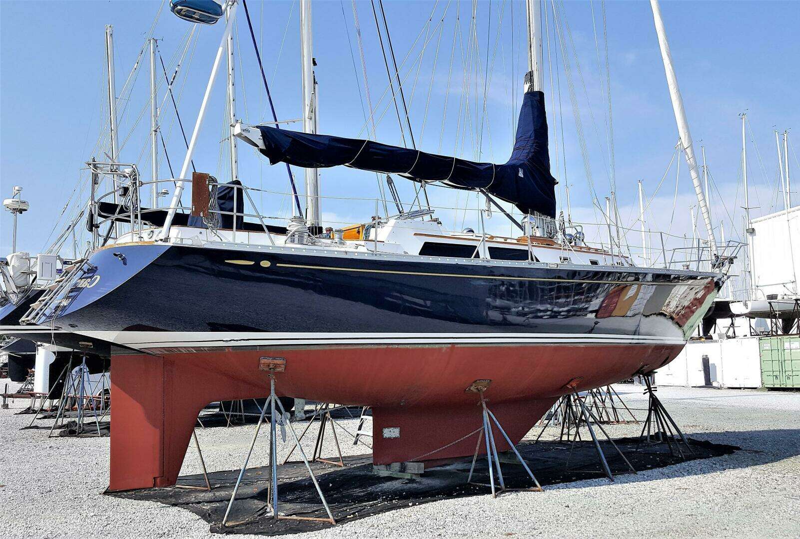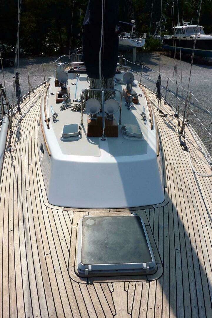 - 2014/2015: Flag blue Awlgrip hull, bow thruster, mast removed/painted, rigging serviced, bottom and keel stripped/repainted, new heads (one electric), new holding tank and plumbing, hydraulic overhaul with added ram for centerboard