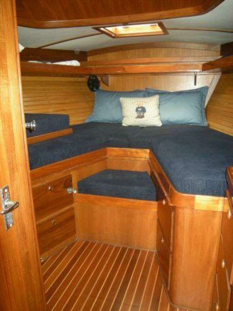Interior finish is satin varnished teak with high gloss trim. Cabin soles are varnished solid teak with light rock maple inlays. Headliners and much of the interior hardware have been replaced. Excellent storage is provided throughout, including lockers, drawers, shelving, and additional stowage under seating.