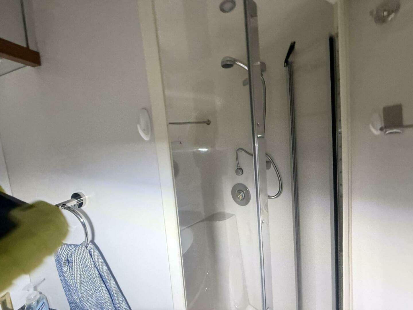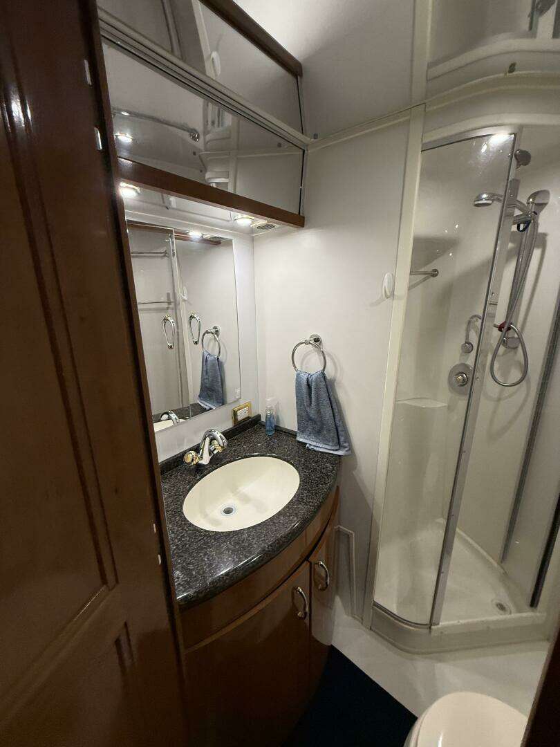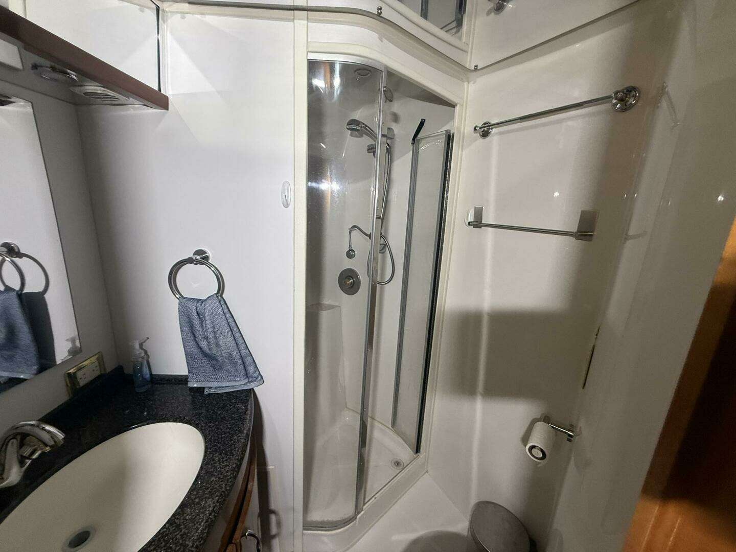 Below deck, this Voyager features a rare and highly desirable three-stateroom layout. The VIP and guest staterooms offer comfortable accommodations with designer fabrics and abundant storage. The forward master stateroom features a walk-around island berth, generous hanging lockers, and ensuite head with separate shower — providing true owner comfort for longer stays aboard.