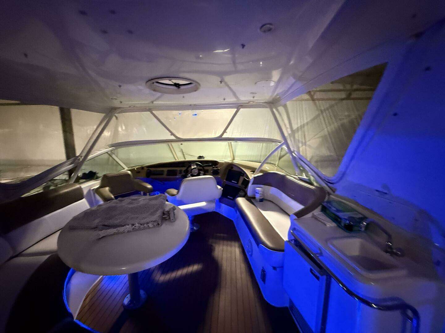 Stepping aboard, you’re welcomed into a bright, full-beam salon through a tinted sliding glass door. The open-concept layout creates an inviting space for entertaining, relaxing, and extended cruising, with panoramic 360-degree views, rich cherry cabinetry, and generous seating throughout.