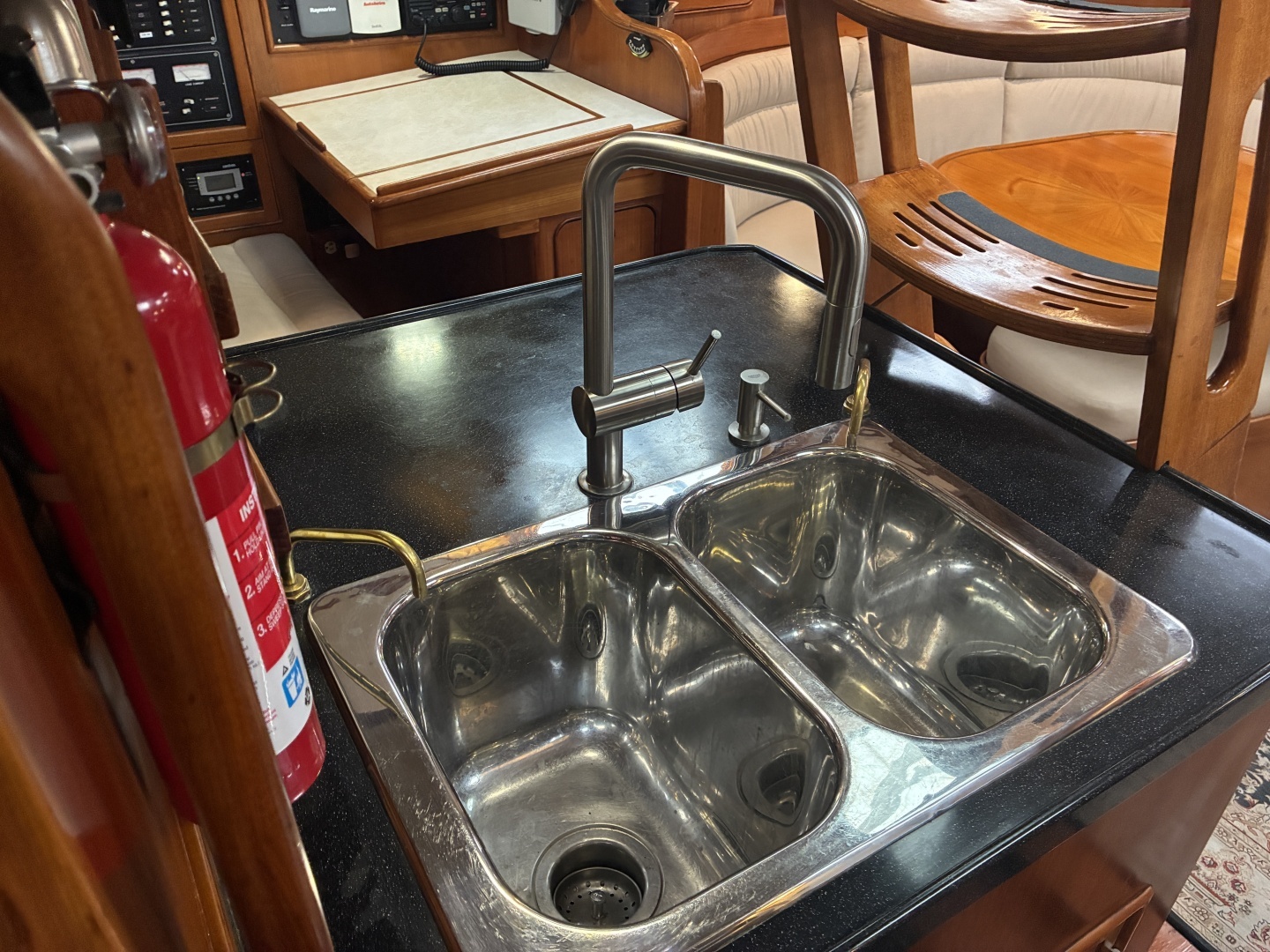 The galley is positioned securely along the passageway, a preferred configuration for offshore sailing. With generous counter space, deep double sinks, refrigeration, a stove with oven, and abundant storage, the galley is designed to support serious cruising and long passages.