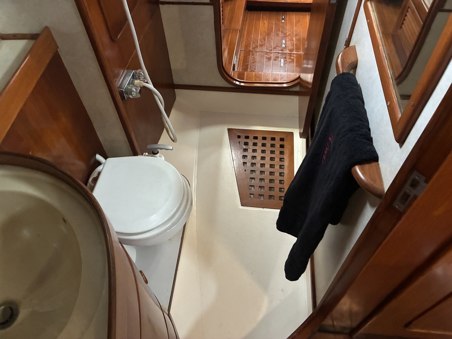 Forward, the guest stateroom provides a comfortable V-berth along with additional storage, making Hawke well-suited for cruising with family or friends. The vessel’s two-head layout provides added convenience and privacy for both owner and guests.