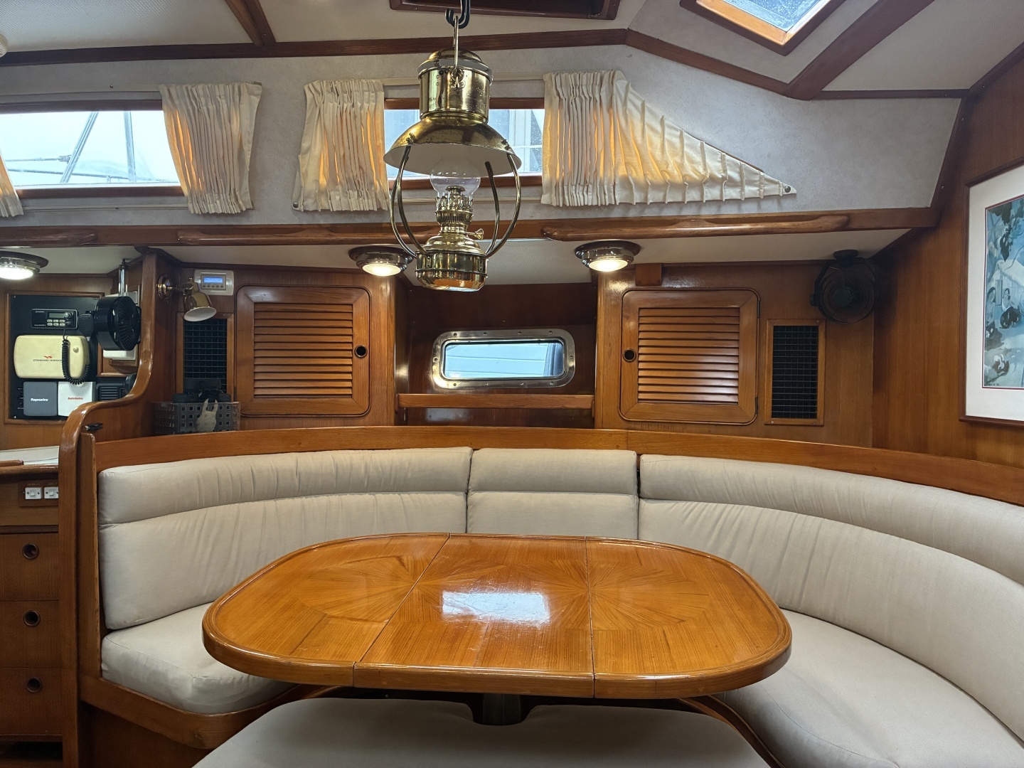 The main salon features a spacious U-shaped settee surrounding a large dining table, providing an inviting gathering space for meals, passage planning, or relaxing after a day under sail. Opposite the dinette, an additional settee and navigation station offer both comfort and practicality for extended cruising.