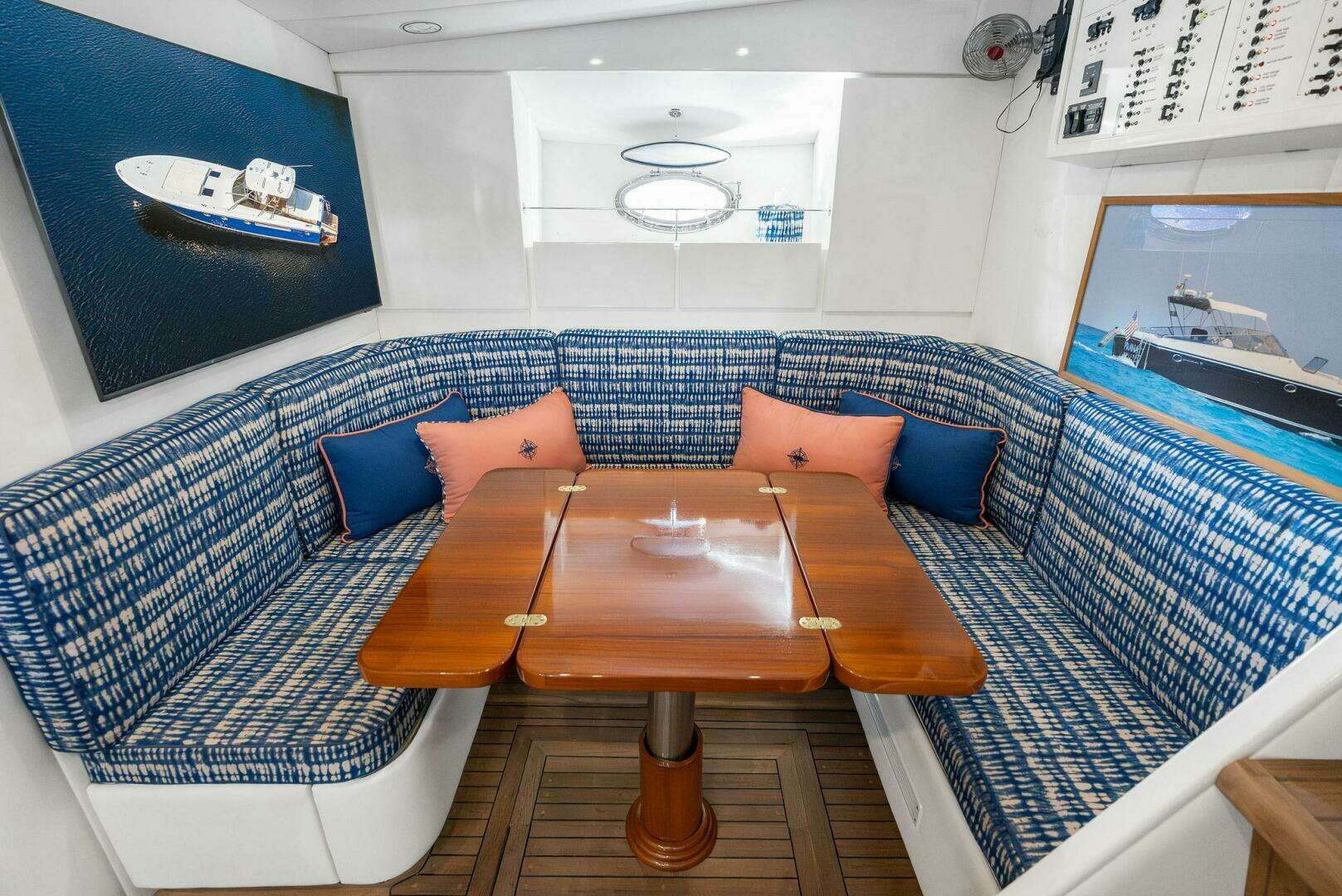 The yacht's interior is adorned with premium fabrics from world-renowned designers Lee Jofa and Pindler, ensuring the tactile experience that compliments the visual splendor. This attention to detail extends to the exterior, where high-performance upholstery from PPS UF Ultrafabrics and Perennials combines style with durability, ideally suited for life at sea.