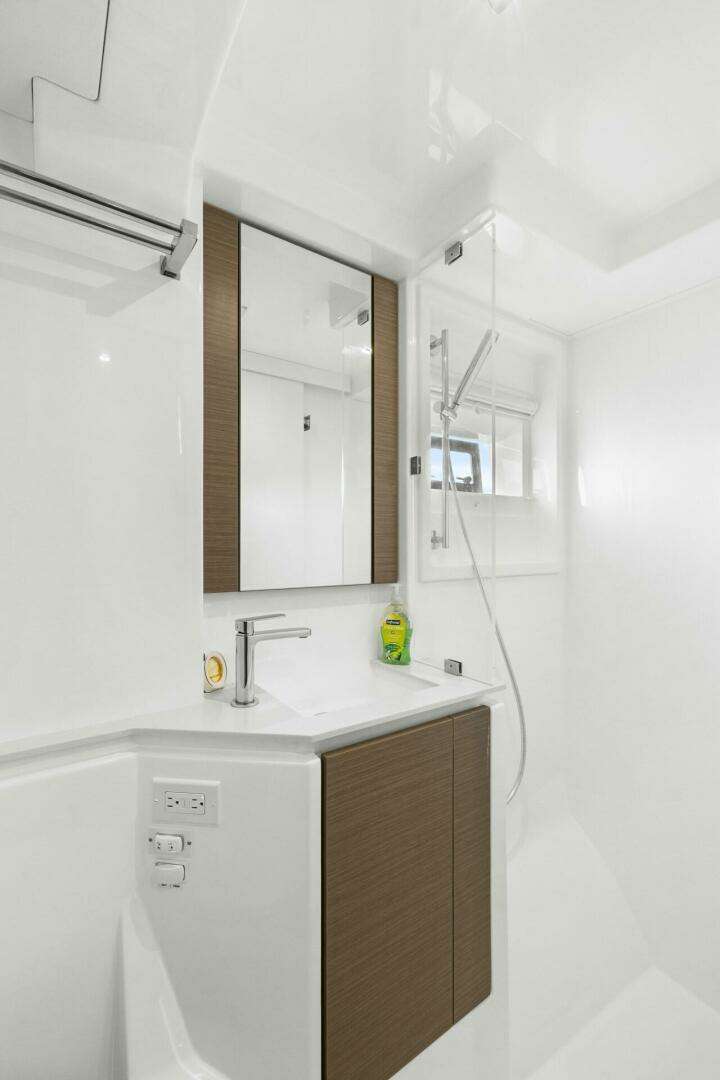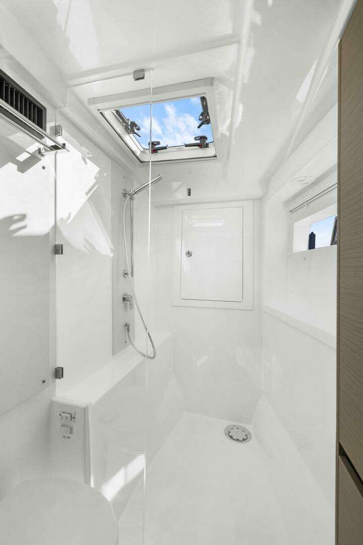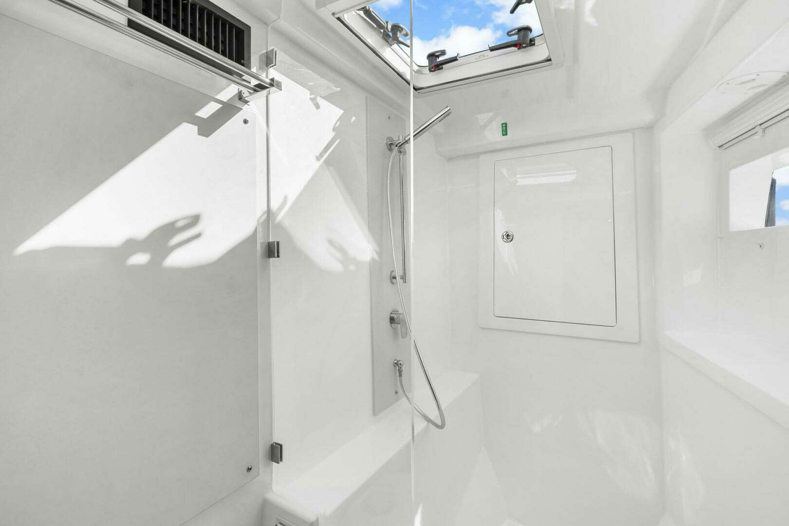 - The cabin feature full length mirrors, 12V fans and oversized hull-side windows as well flush-mounted deck hatches for superior ventilation and natural light