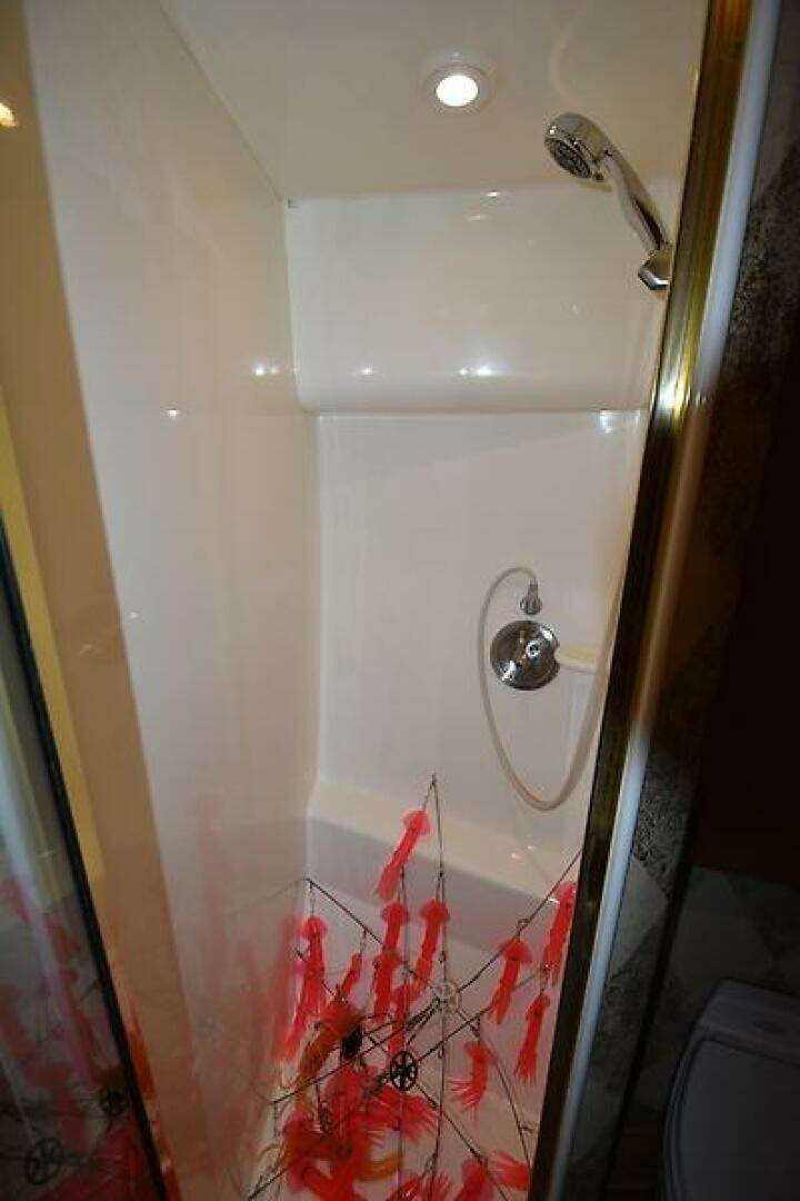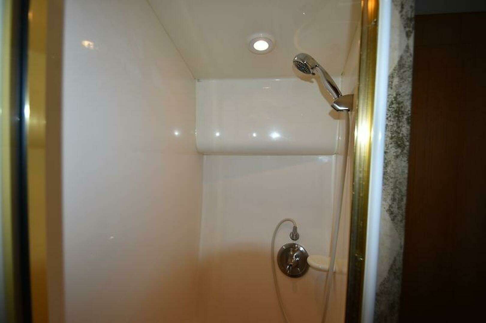 - GUEST HEAD AND SHOWER: Located just forward of the Guest Stateroom with hallway access you will find the Guest/Day head. With Teak and Holly Amtico flooring, Vac-U-Flush toilet, Teak base cabinet with storage doors, Corian Countertop with undermount sink and designer faucet, Mirrored medicine cabinet, stand-up shower stall with bi-fold shower door, shower wand, shelf and seat in the fiberglass shower stall.