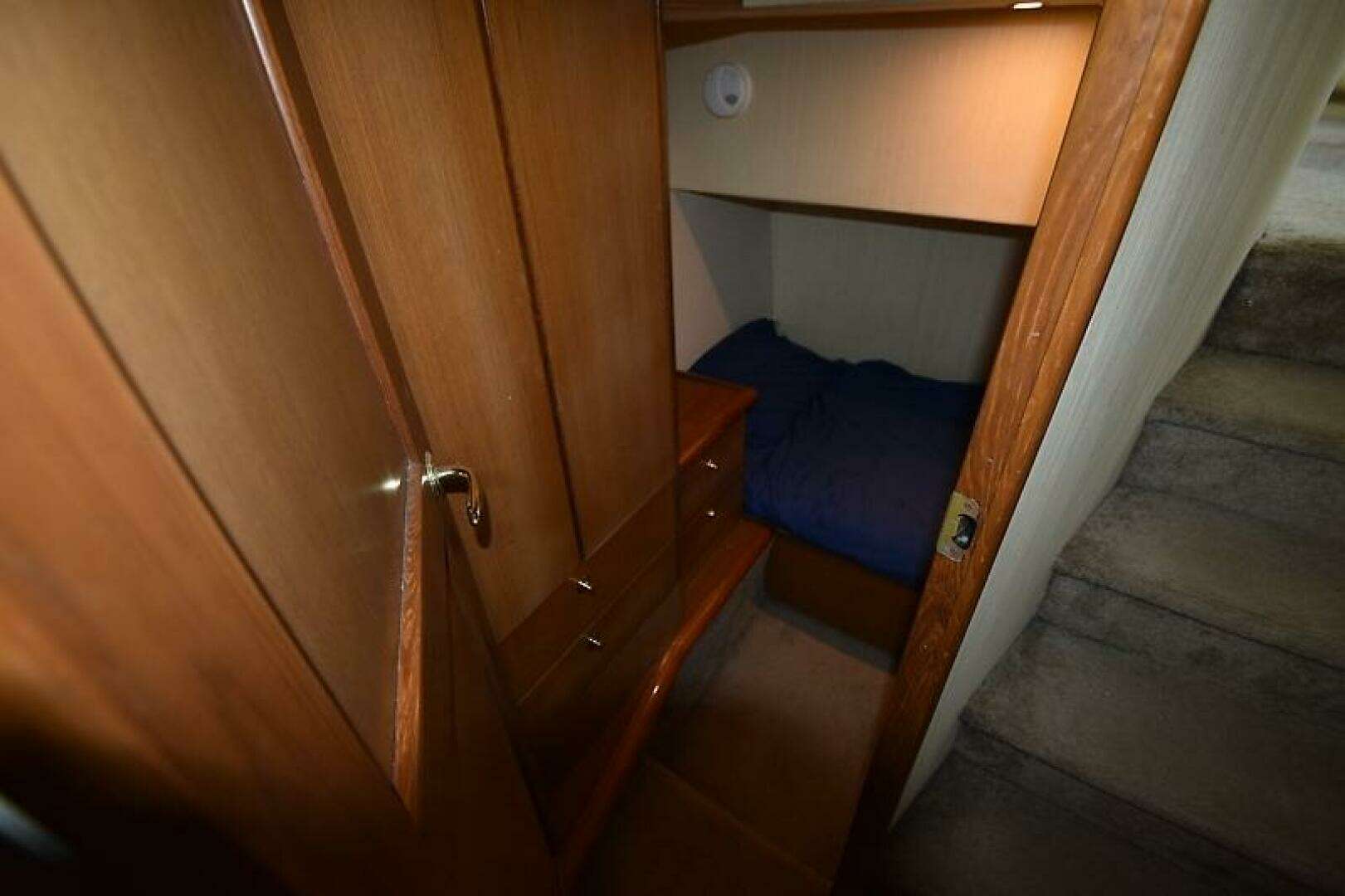 - FORWARD BUNKROOM: Located forward in the vessel you will find the 3rd stateroom. With Crossover bunks and a large bank of teak storage drawers along the Stbd side, and Upper Cabinets along the Port side, Overhead lighting and reading lamps