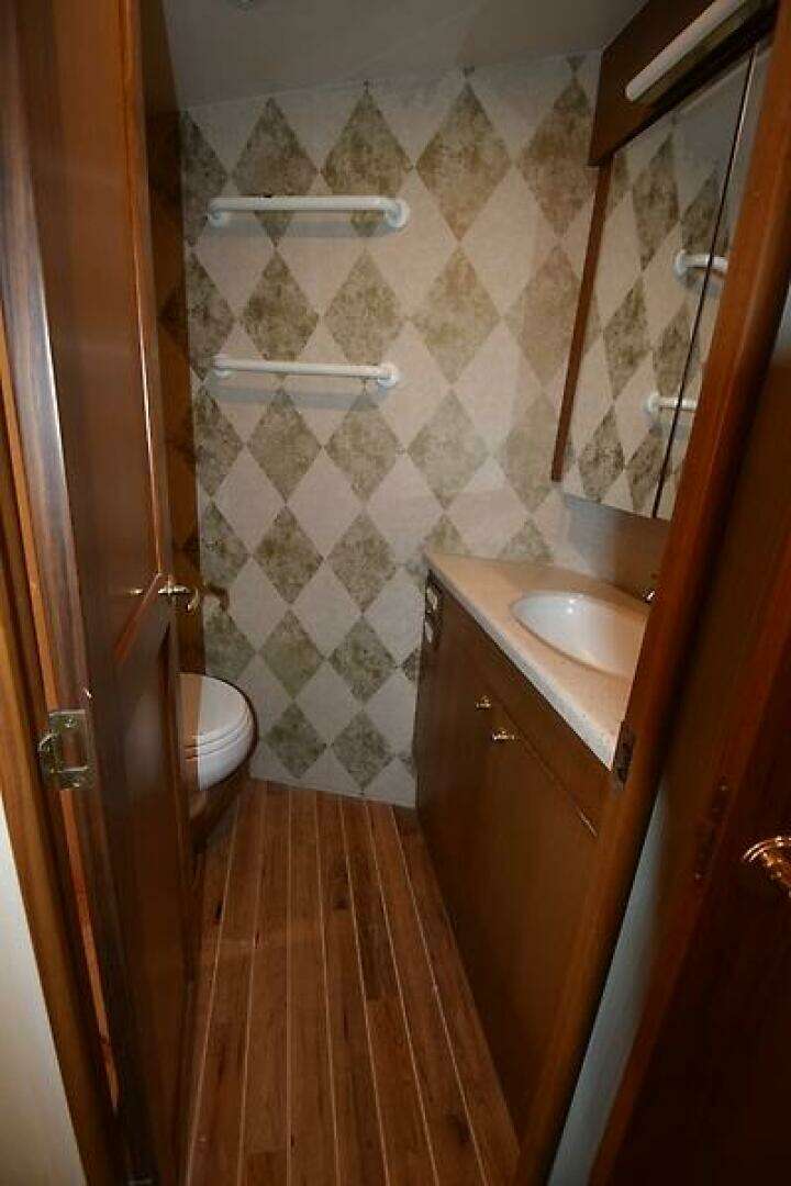 - MASTER HEAD AND SHOWER: Teak and Holly Amtico flooring, Vanity cabinet with teak doors (storage beneath), mirrored medicine cabinet, Corian counter with undermount sink. Vac-U-Flush toilet, Stand-Up shower with bi-fold shower door, fiberglass shower stall with wand, shelf and light.
