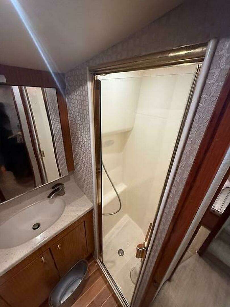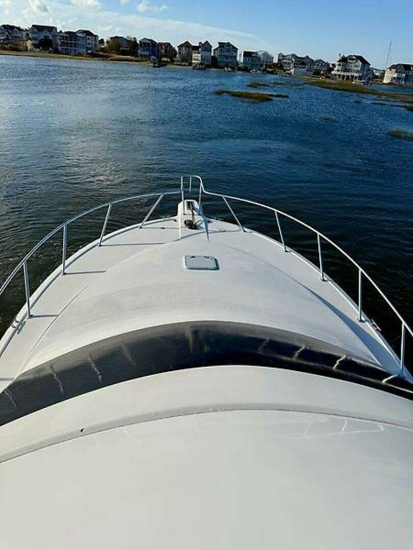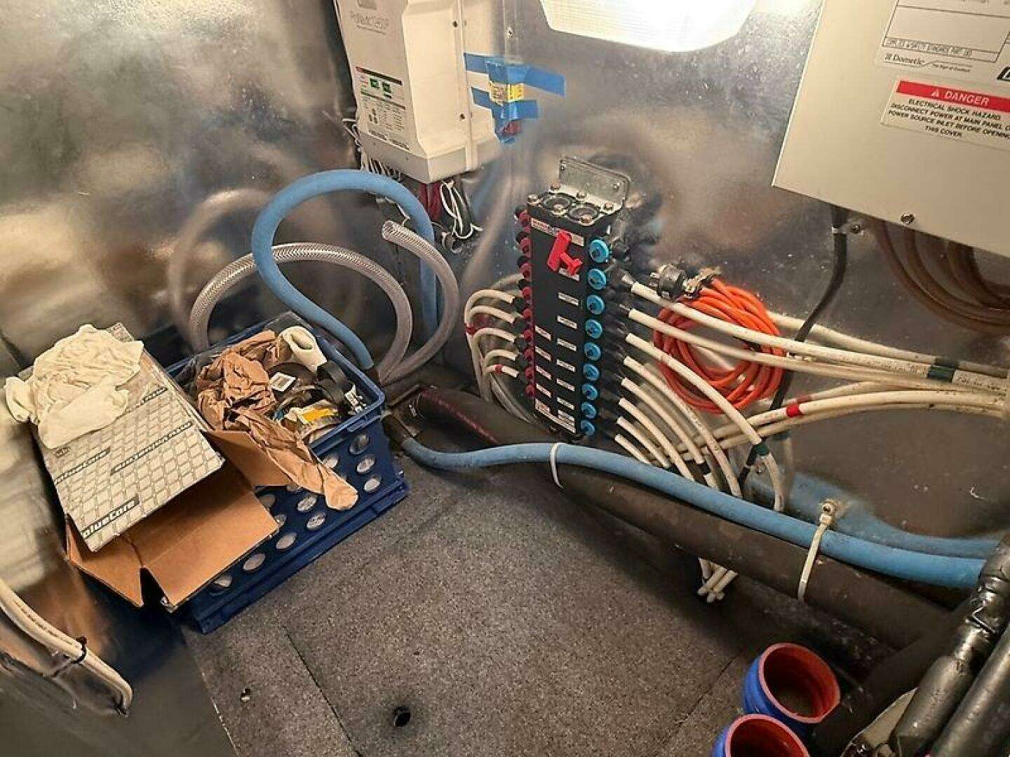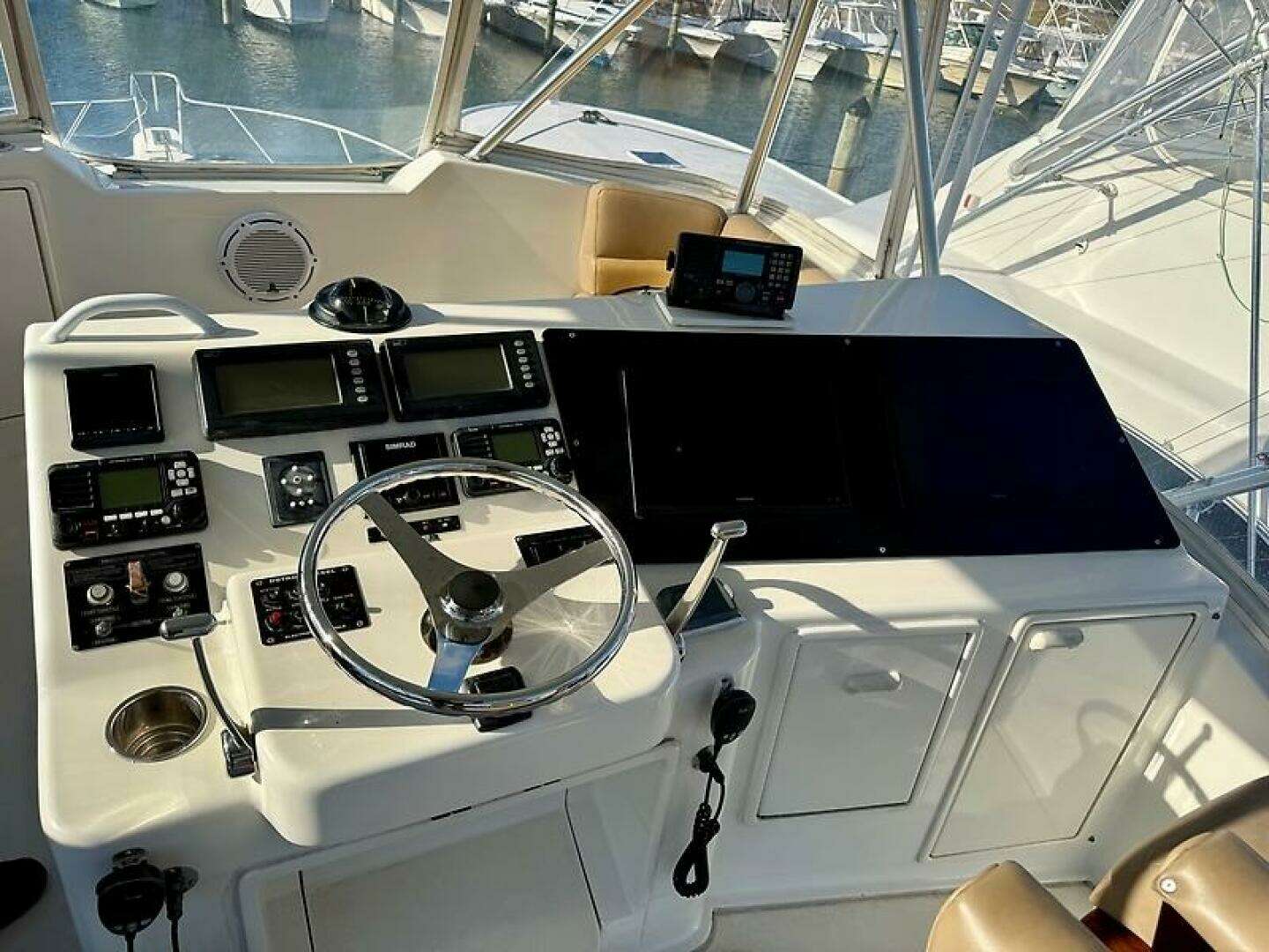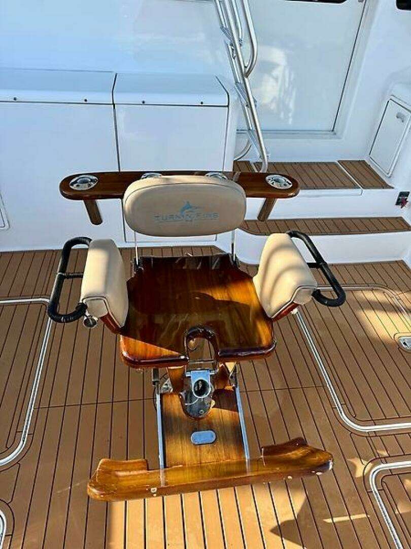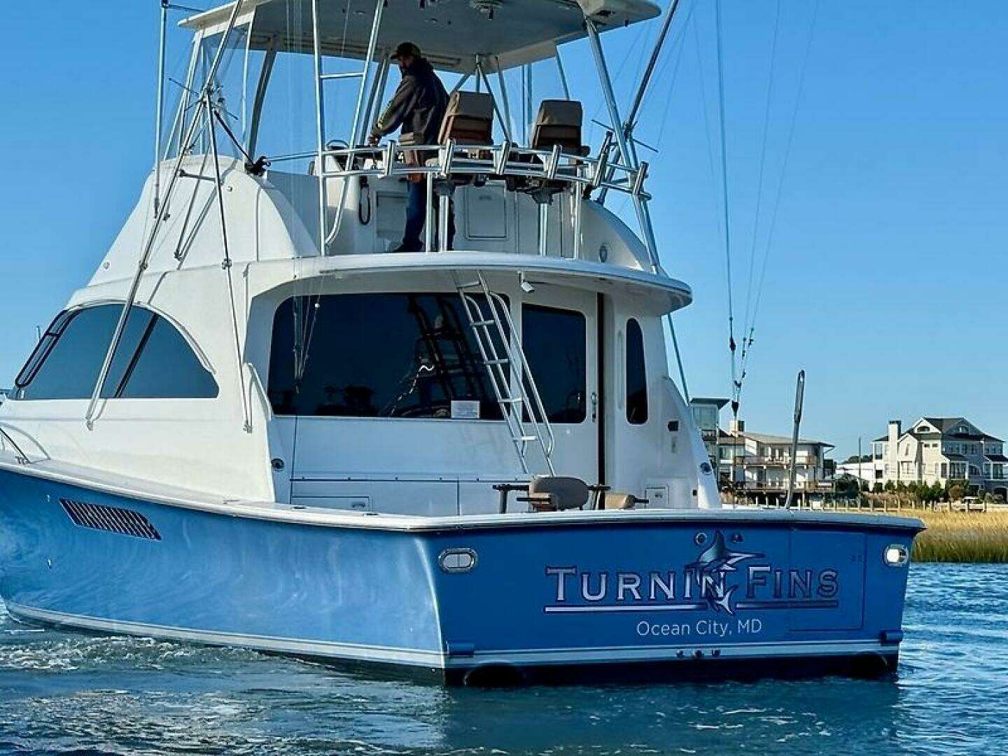 Turnin Fin's large cockpit incorporates insulated fish boxes, a transom mounted circulating live bait well, tackle locker, a bait prep center with freezer and fresh water sink. Game fish are landed through a hinged gate and transom door, freezer, fish boxes, rod holders, stereo speakers, fresh and seawater wash down and dockside connection that is starboard. Access to the engine room, lazarette and fly-bridge.