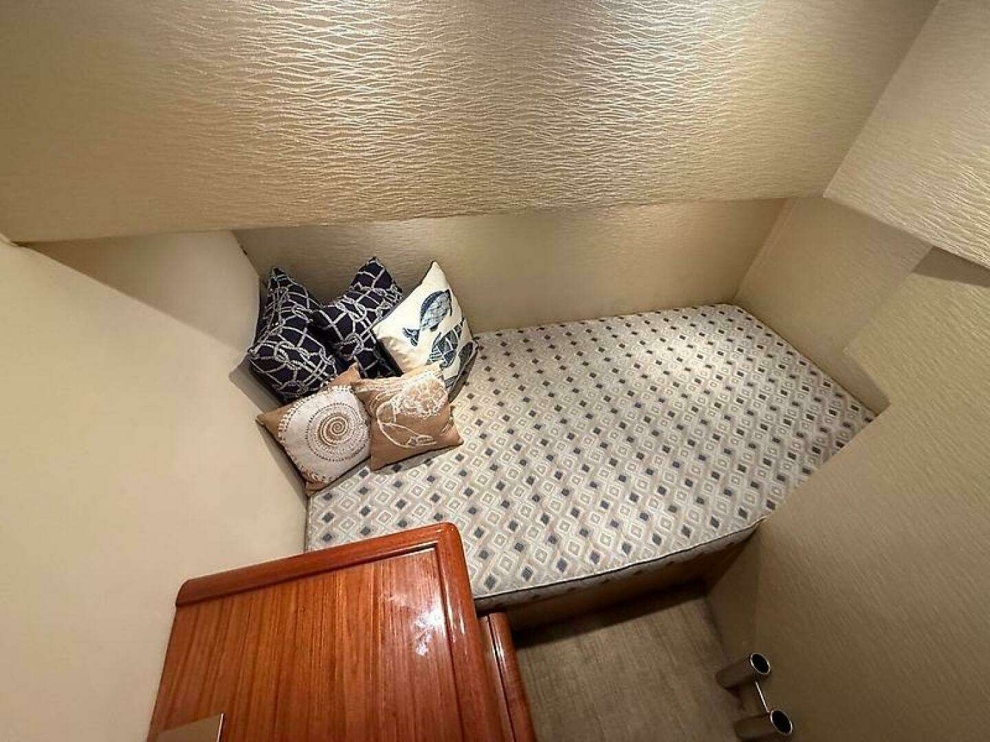 The Bridge features a fully instrumented angled helm station with excellent visibility. Guests enjoy the comfort of cushioned lounge seating forward of the console. Twin Captains chairs upgraded. A hard top completely enclosed with EZ2CY and a hatch is also located in the hardtop.