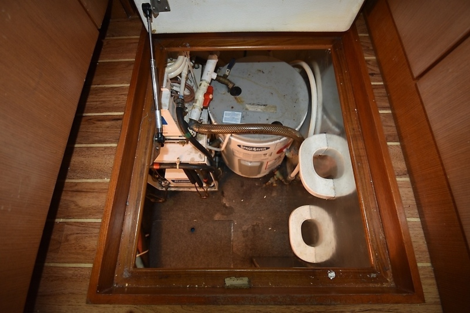 - Bonus Storage Space located via a large hatch in the Galley Floor (Water Heater, Fresh water manifold, Sentry 12v 60 amp Battery Charger, and 2 HVAC Condensing Units located in here, a 24k btu unit for the Salon, and a 16k btu unit for the Staterooms.)
