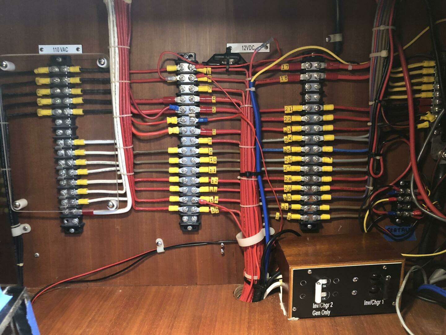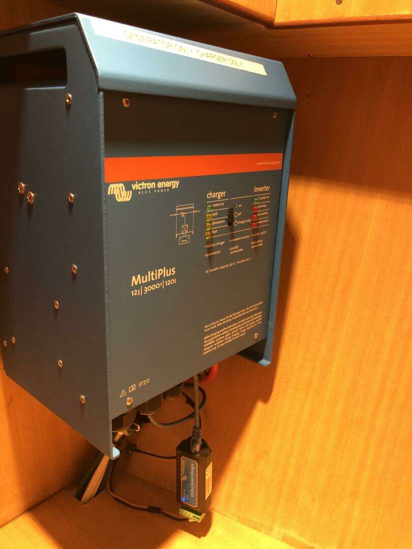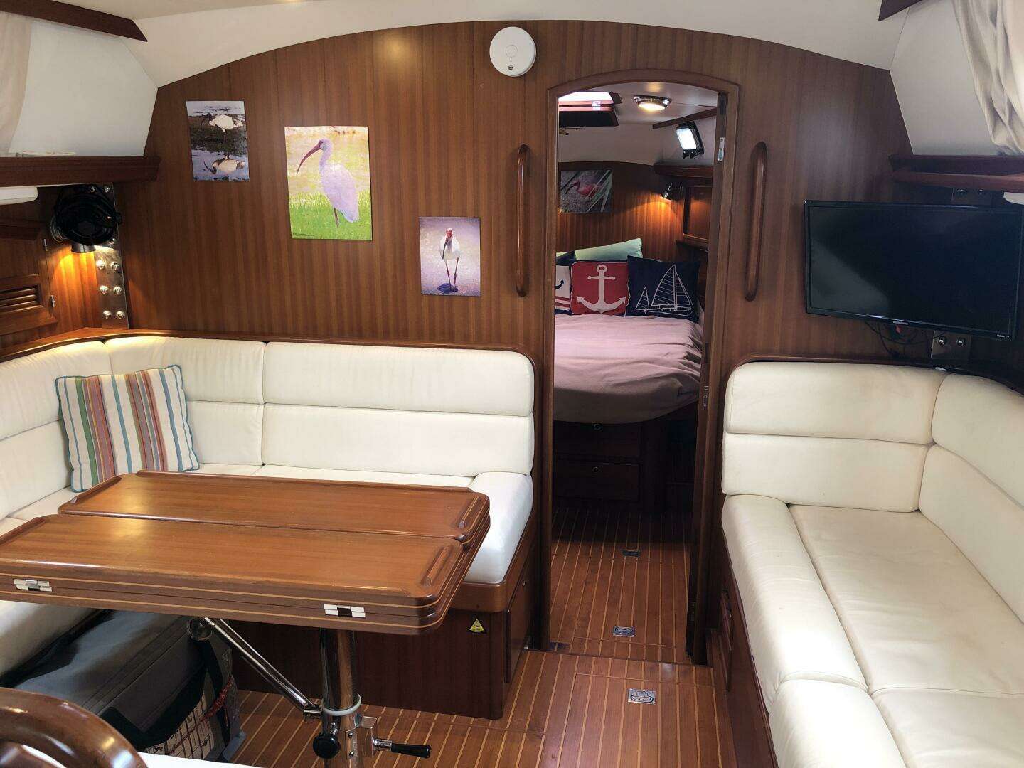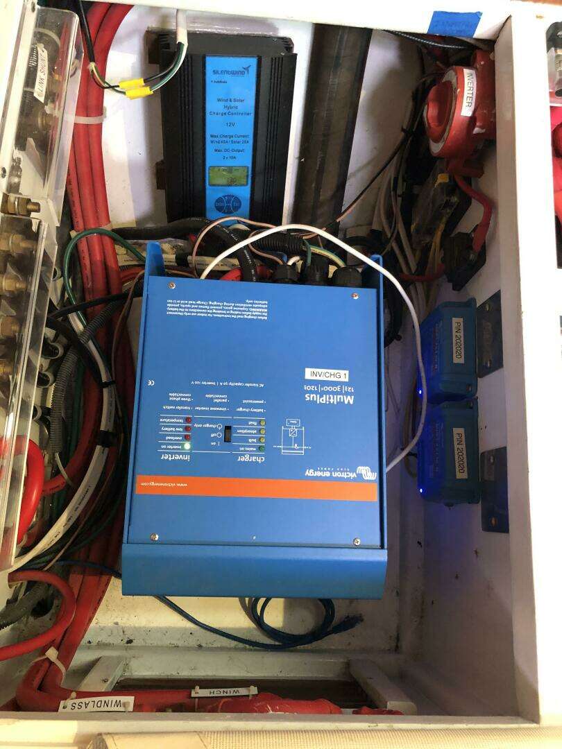 The forward cabin features a centerline queen with stowage under, outboard lockers port and starboard, a hanging locker and shelves. The forward head has a slide out sink with shower. The saloon has a port side U-shaped seating around a fiddled table with hinged leaves and adjustable height. Beneath port settee, is a new holding tank for the forward head, along with additional storage. Below the starboard settee in the salon is the house battery bank, primary inverter/charger, wind gen charge controller, solar charge controllers, and air conditioner for fore and aft cabins.