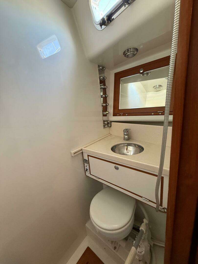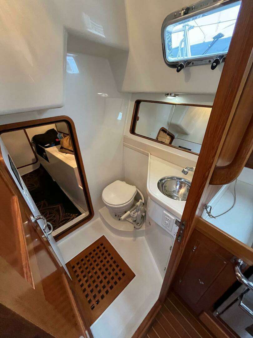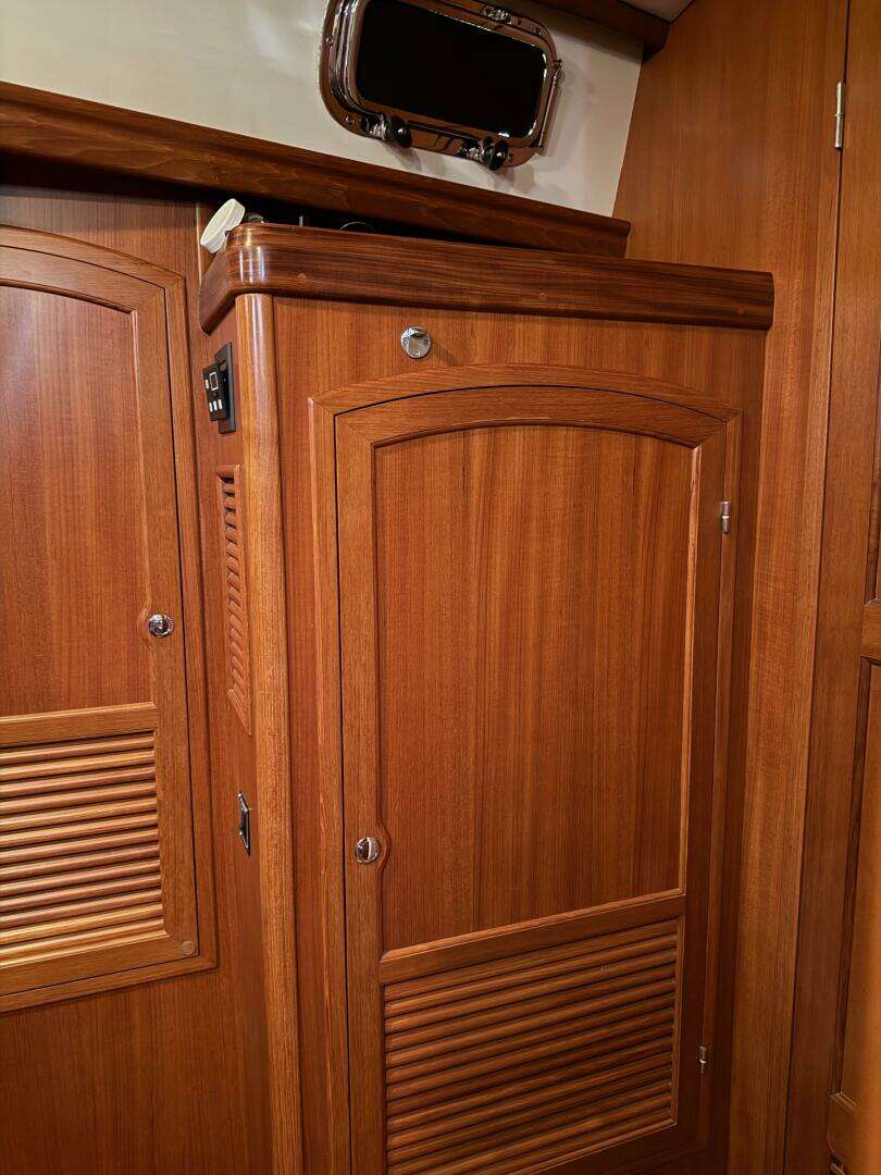 Opposite the galley, the navigation station is positioned adjacent to the companionway for clear communication with the helm. The top-opening chart table accommodates full-size charts, with electronics including a Garmin repeater, ICOM SSB and ICOM VHF radios, Victron Cerbo, Spectra watermaker, Fusion radio and the Northern Lights generator remote panel, with the electrical panel located just aft. The aft guest cabin features a comfortable double berth with lift-up storage, lockers, drawers, bookshelves, a hanging locker, and two opening ports into the cockpit for excellent ventilation. Nearby, the aft head is finished in molded white surfaces and is ideally located near the companionway, perfect for shedding foul-weather gear before entering the main cabin, and includes a Corian countertop with stainless sink and mirrored cabinet.