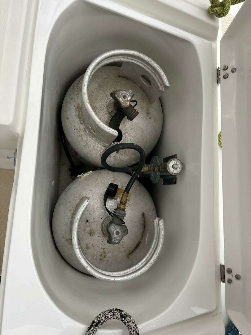 One of Gadabout’s standout features is her exceptional mechanical and systems access. The companionway stairs lift on gas struts to reveal a well-insulated engine compartment, with additional access panels providing reach to all sides of the engine. A dedicated mechanical and workshop space is accessed via the aft head and cockpit lazarette, offering standing headroom when open, a full workbench, tool and spare storage, and the auxiliary freezer below. A sound-enclosed Northern Lights generator is mounted on centerline aft of the main engine, with excellent access to the shaft seal and steering quadrant further aft—serviceability rarely found on yachts of this size.