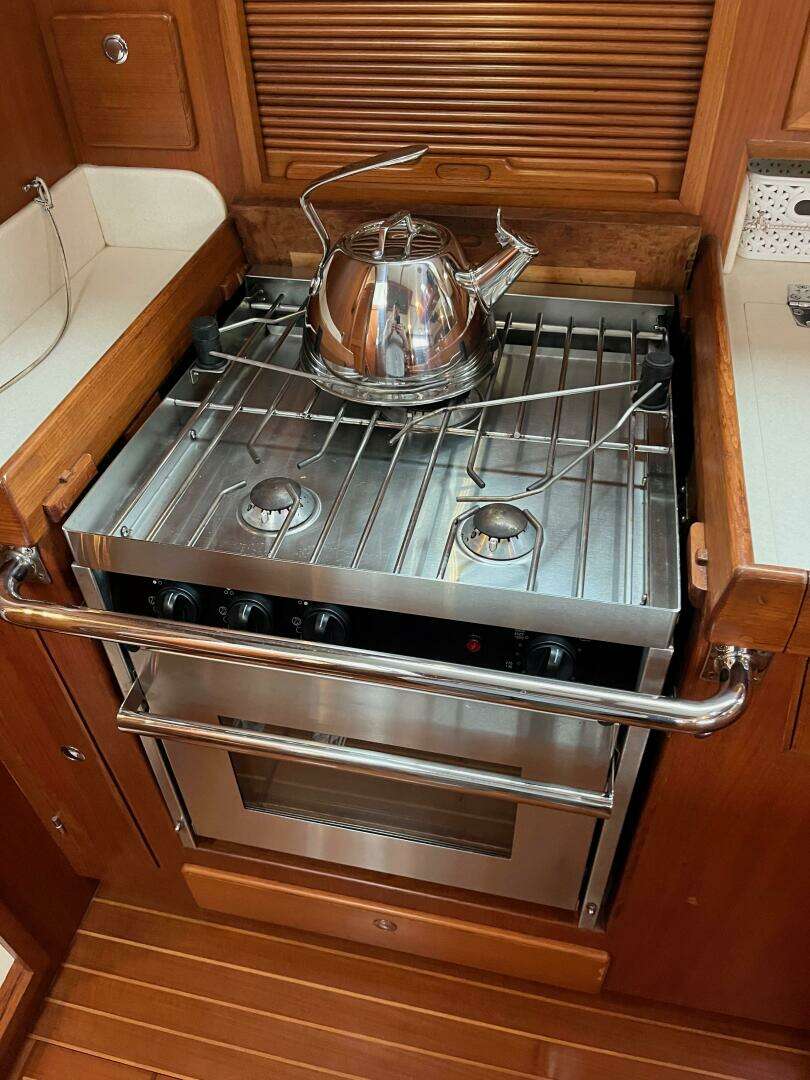 Aft, the main salon offers a seven-foot U-shaped dinette to port with a drop-leaf table that converts to a double berth, and a straight settee to starboard that serves as a comfortable sea berth underway. The center section of the starboard backrest lowers to form a small table for cards or drinks. Lockers and bookshelves line both sides, and seating is upholstered in Ultrasuede. The U-shaped galley to port is designed for offshore use, with Corian counters, a forward-facing double stainless sink, Force 10 three-burner propane stove with oven and broiler, microwave oven, and both pressure and foot-pump hot and cold water. Refrigeration includes a large top-loading fridge and auxiliary freezer, both Frigoboat-cooled, with ample storage. Braced into the galley, the cook remains secure underway.