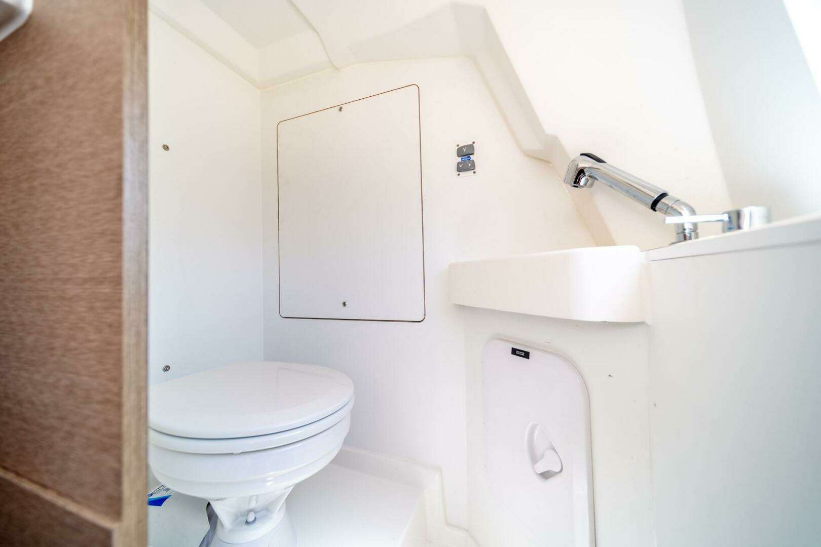 Located under the seating on the aft deck accessed by and teak and stainless-steel ladder
