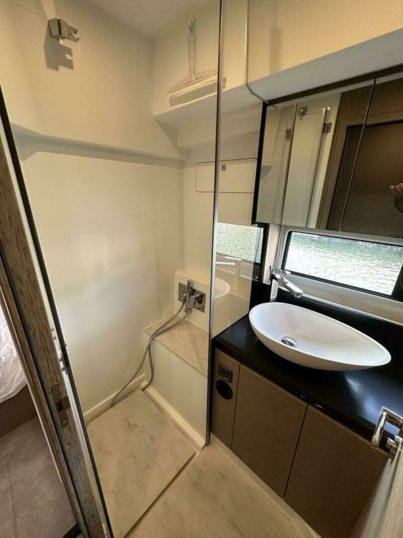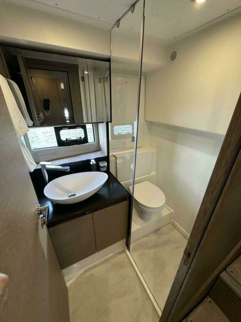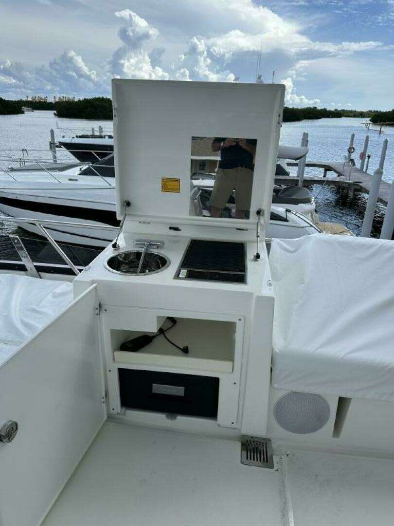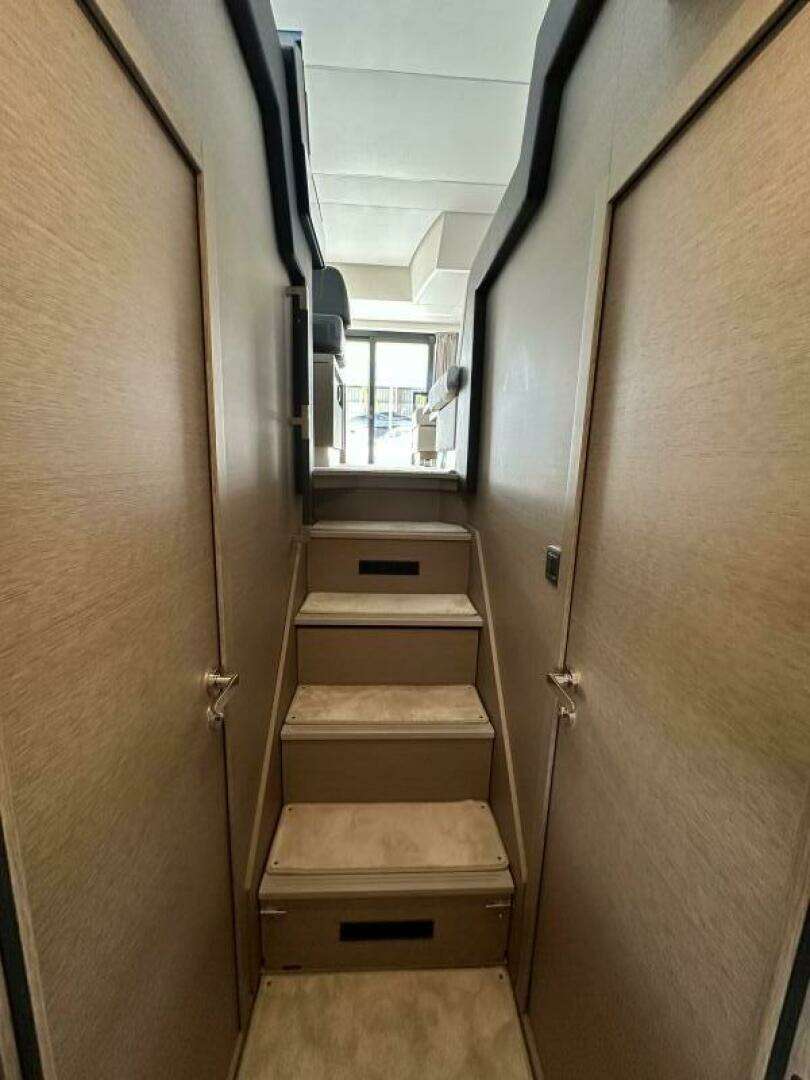 This 2024, PRESTIGE 460 FLY offers the amenities and the feel of a much larger motor yacht than one might expect. This yacht features many upgrades and options, but let me list just a few. She offers the North American Package that includes numerous upgrades and features such as a teak table in the cockpit, windlass anchor controls, stainless steel bow protection, protective covers for exterior seating, a wash down system, and a Glendinning shore power cable system. The Garmin Electronics package at the lower helm features two 12-inch Garmin screens, radar, autopilot, and VHF. A complete Flybridge Electronics Package is also included. She boasts both an upgraded interior as well as an exterior soft goods package. A Bowers and Wilkens Stereo system with a multizone receiver including B&W Speakers in the salon and on the exterior decks. Her comfort has been enhanced by installing a SEAKEEPER 5 Gyro which is not usually found in this particular model.