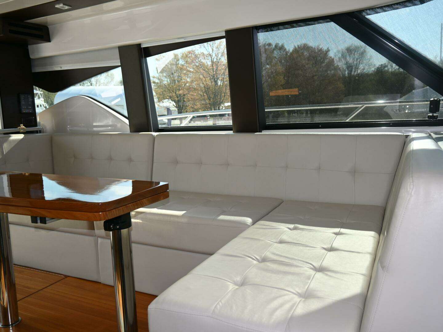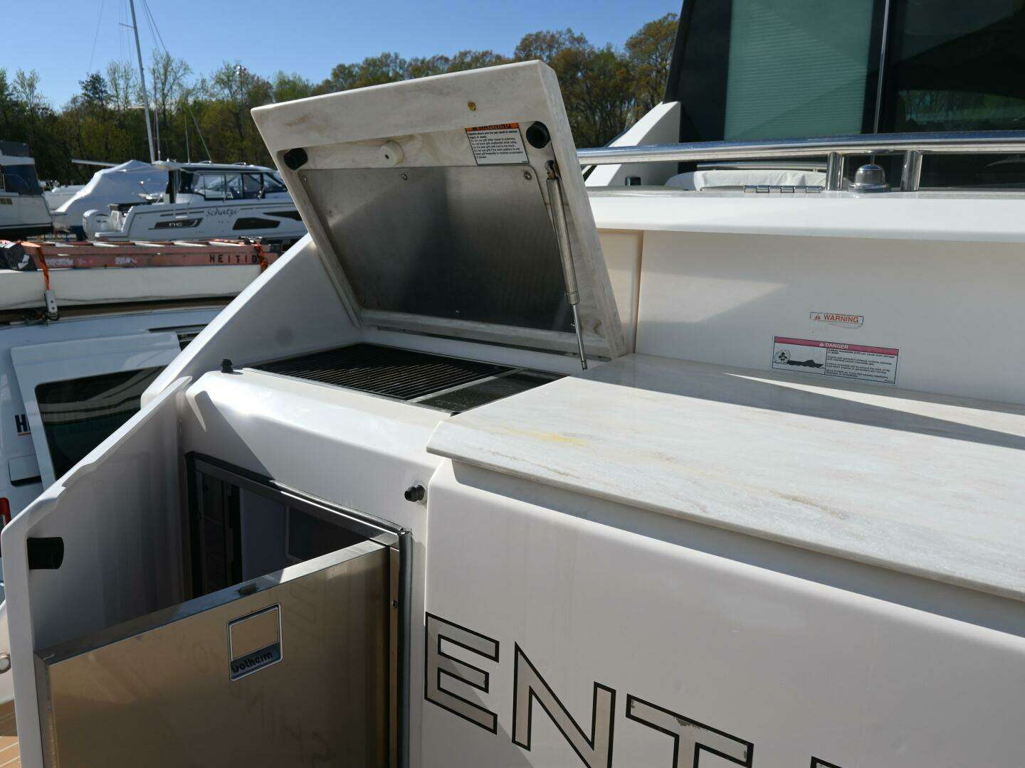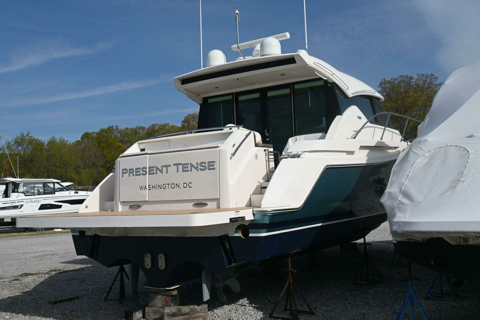 Her custom “Light Aqua Effect” hull paint turns heads wherever she goes, while the spacious cockpit and salon layout provide a seamless flow between indoor and outdoor living. A large swim platform, transom grill, outdoor refrigerator, retractable sunshade and expansive bow sun pad make her ideal for entertaining, while the massive transom trunk with powered door adds impressive storage for day trips, weekend getaways, or extended cruising.