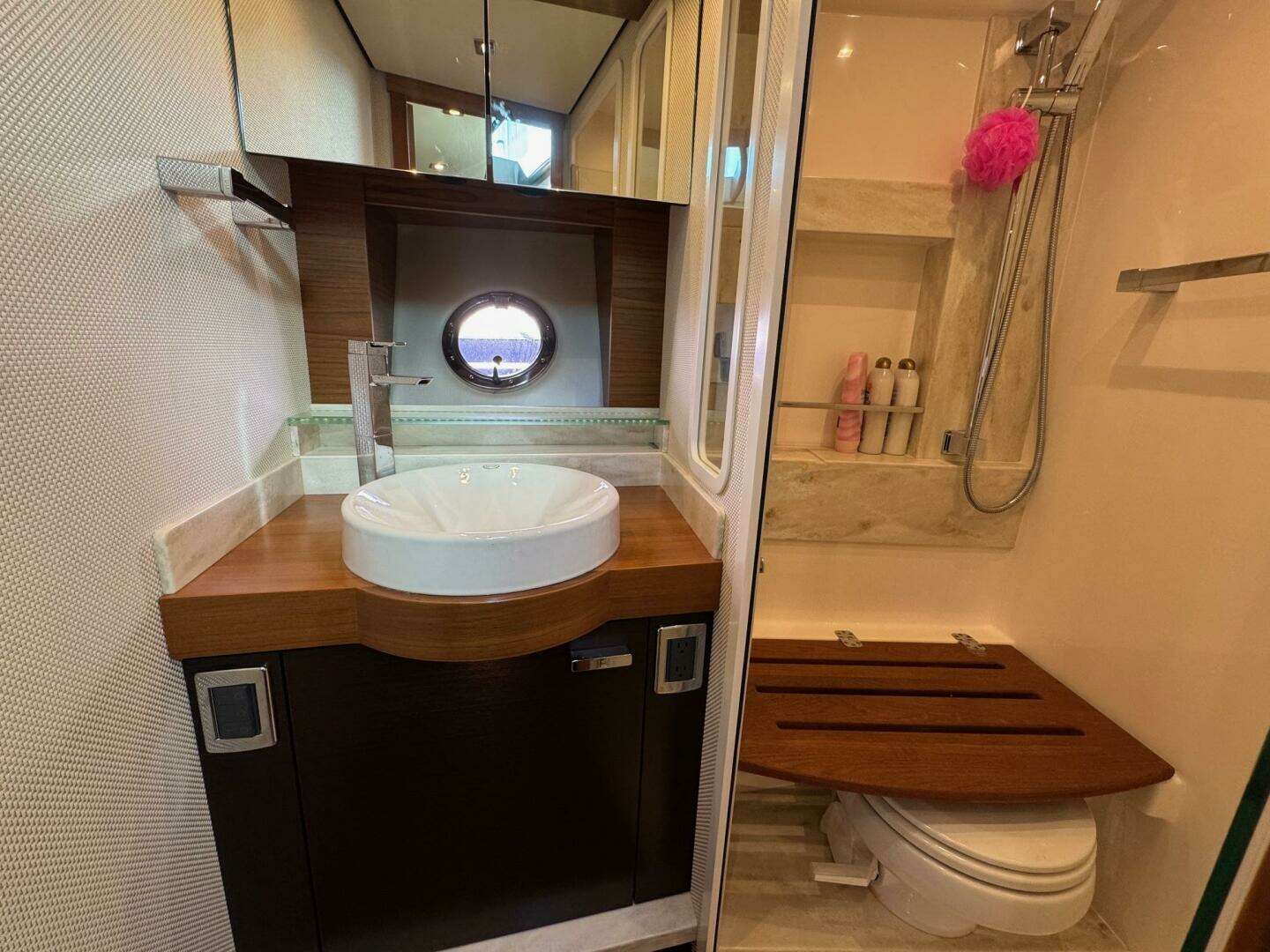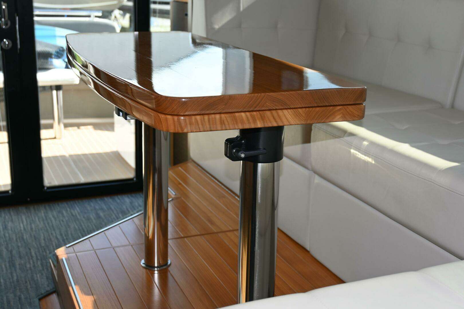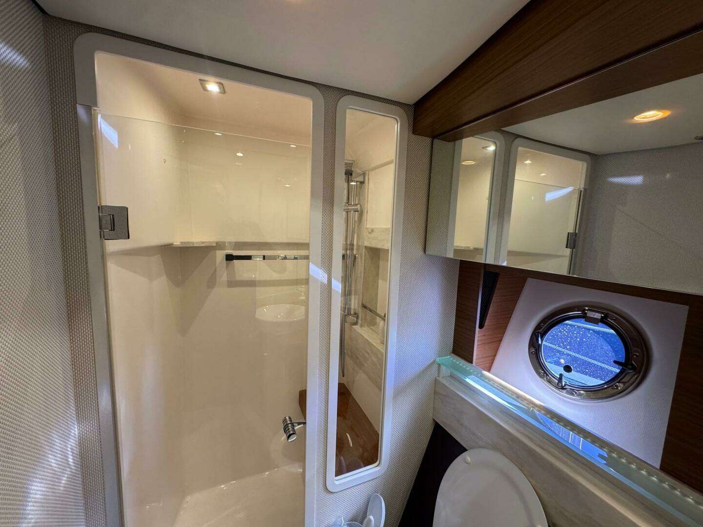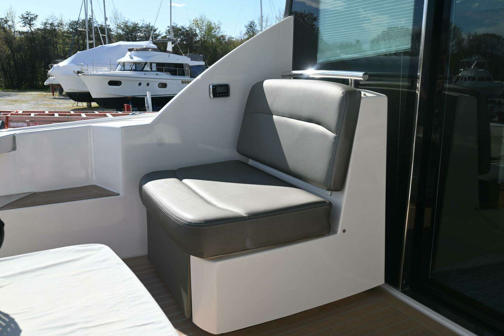 Her custom “Light Aqua Effect” hull paint turns heads wherever she goes, while the spacious cockpit and salon layout provide a seamless flow between indoor and outdoor living. A large swim platform, transom grill, outdoor refrigerator, retractable sunshade and expansive bow sun pad make her ideal for entertaining, while the massive transom trunk with powered door adds impressive storage for day trips, weekend getaways, or extended cruising.