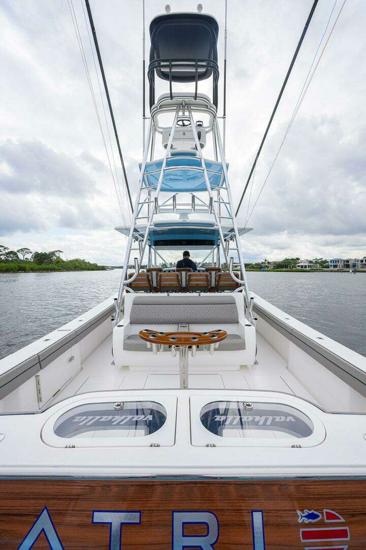 Not only is this Shimmering Blue 2023 Valhalla Boatworks V-46 PATRIOT beautiful, but it's also a beast. The Valhalla Boatworks V-46 model was designed to be a powerhouse for those who demand excellence and comfort on the water. This 2023 model is powered by Triple Mercury V12 600 HP engines with extended warranty, features a Mercury joystick, two on deck live well fittings, faux teak accents, rocket launcher, Release Marine helm pod and seating, underwater lights, upgraded upholstery, and a custom upgraded electronics and entertainment package from Atlantic Marine Electronics to compliment the custom tower designed by Palm Beach Towers.