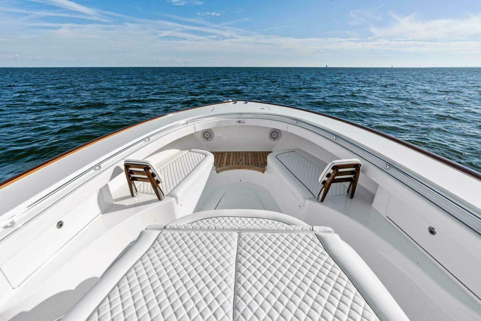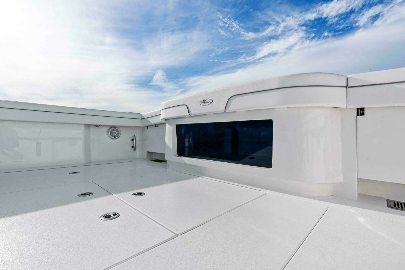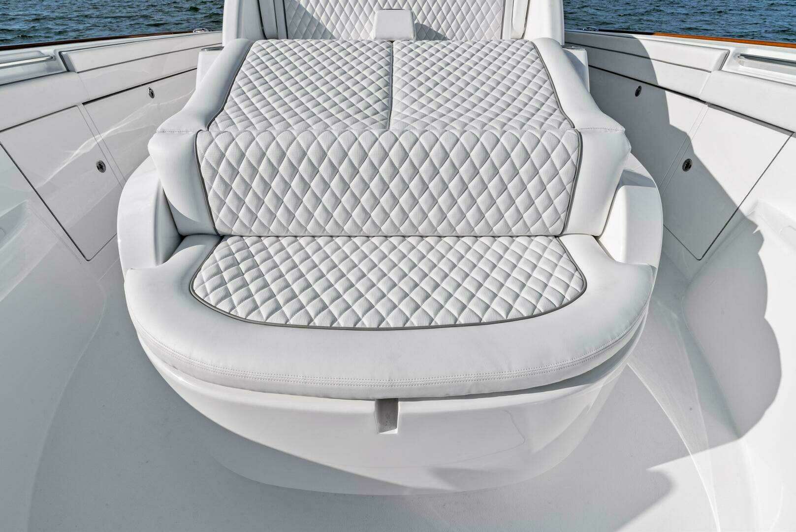 • Durable white outdoor upholstery for console lounge, bench seating, coaming bolsters and cockpit cooler seating