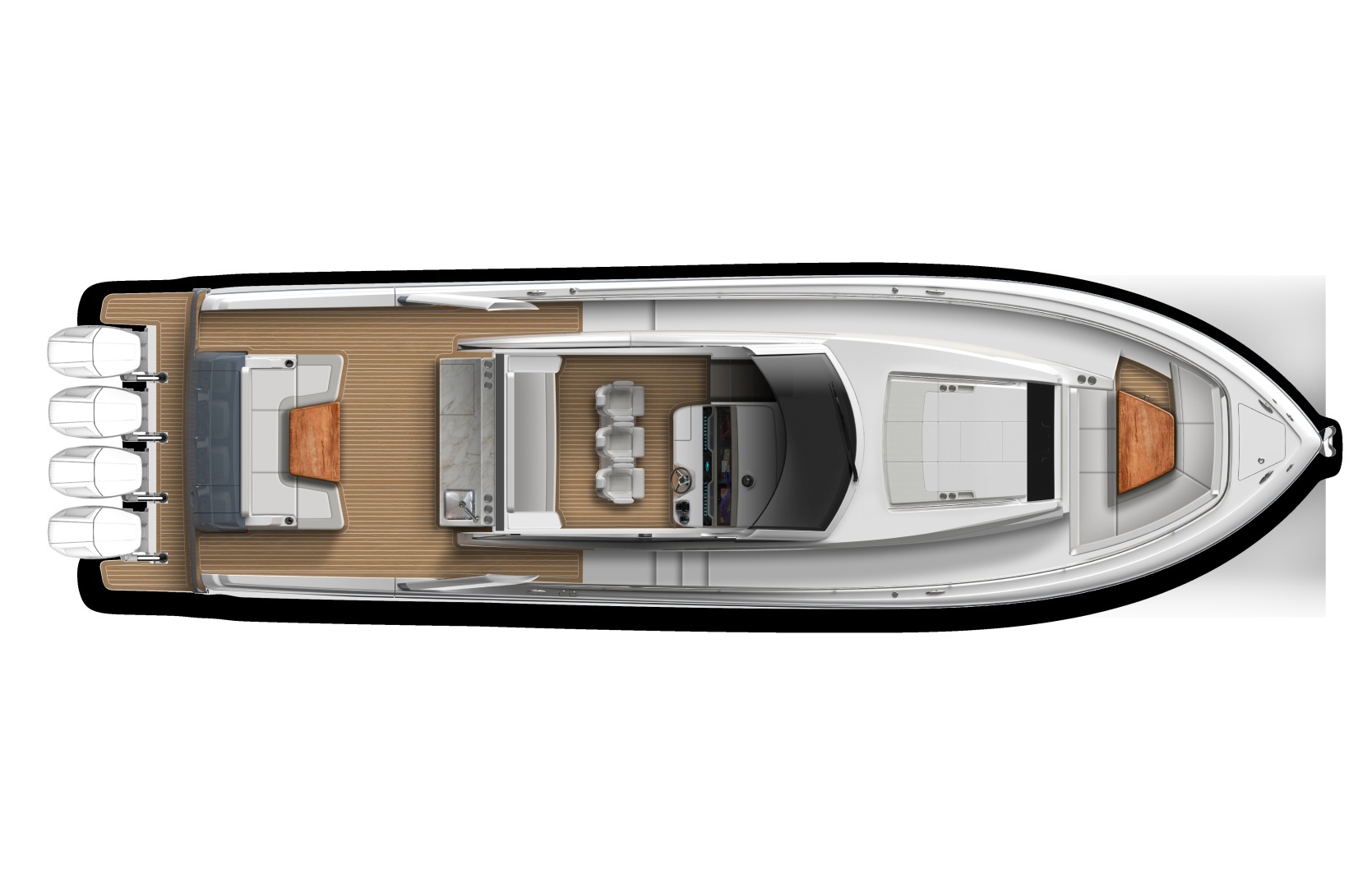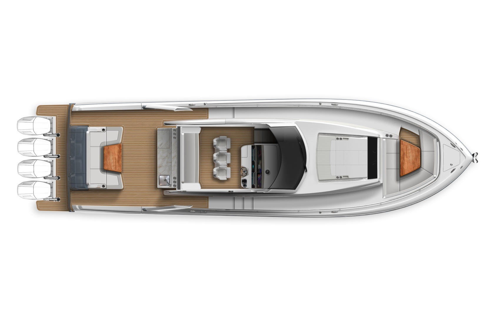 The Valhalla 46 Sport Yacht rides on Michael Peters’ patented double-stepped hull, delivering a fast, efficient, and stable ride. Owners can select triple or quad Mercury V12 Verado outboards, supported by 800 gallons of fuel capacity for exceptional range and offshore capability.