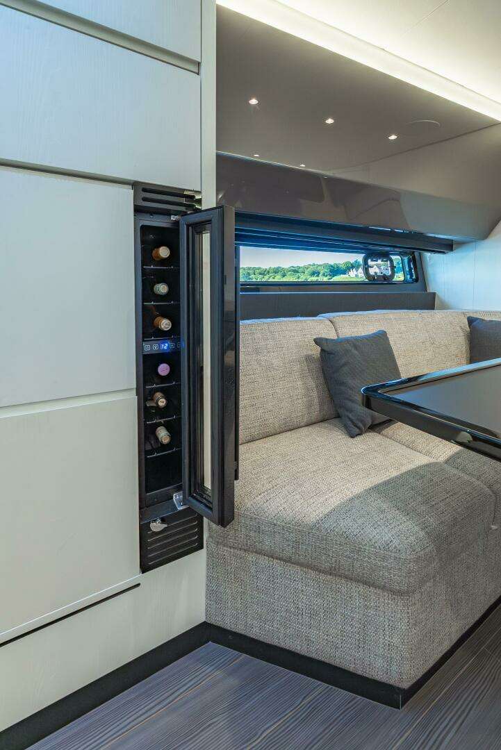 Francesco Struglia’s design language continues inside with a sleek, modern aesthetic defined by high-gloss finishes, integrated lighting, and luxurious Italian craftsmanship. The Main Cabin benefits from expansive hull windows and integrated skylights, which enlarge the space with natural light. A convertible dinette to port transforms into a dining or lounging space. The fully equipped Galley opposite has upgraded appliances and ample storage.