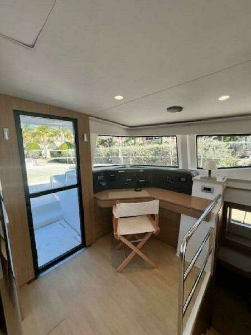 Saloon: chart table reading light, folding seat for chart table, saloon table with bar and solid wood surrounds, dimmable ambient lighting, saloon upholstery bands with armrests, flagpole and bracket