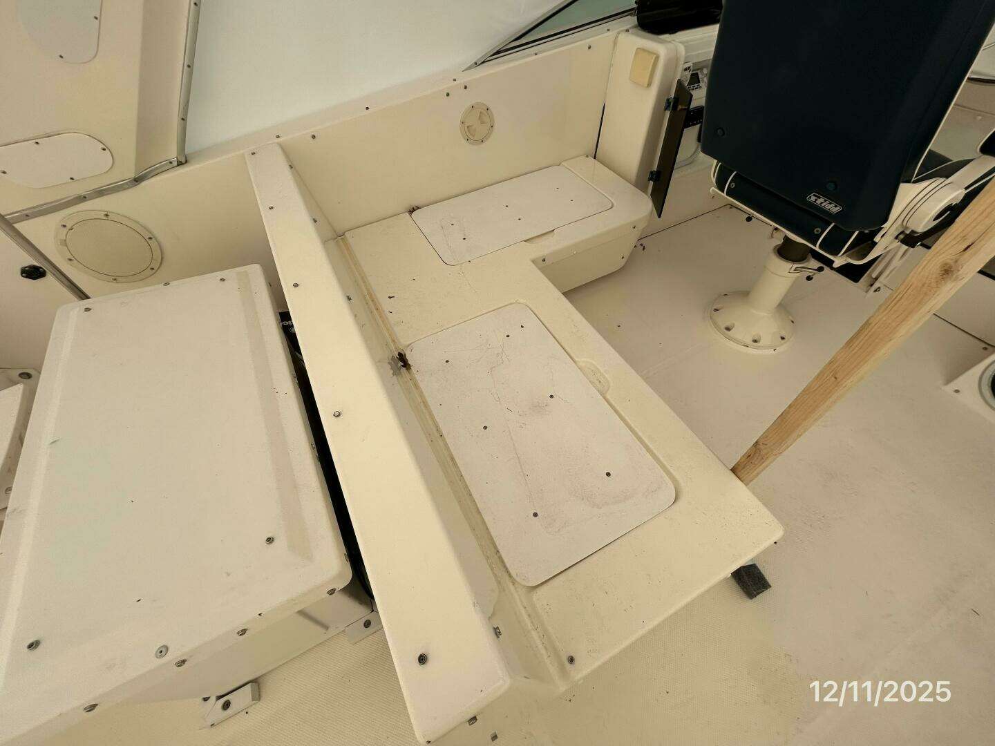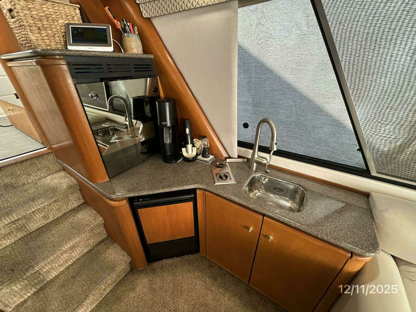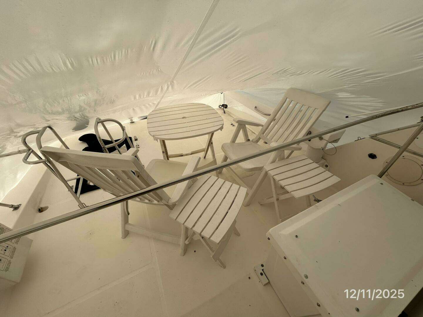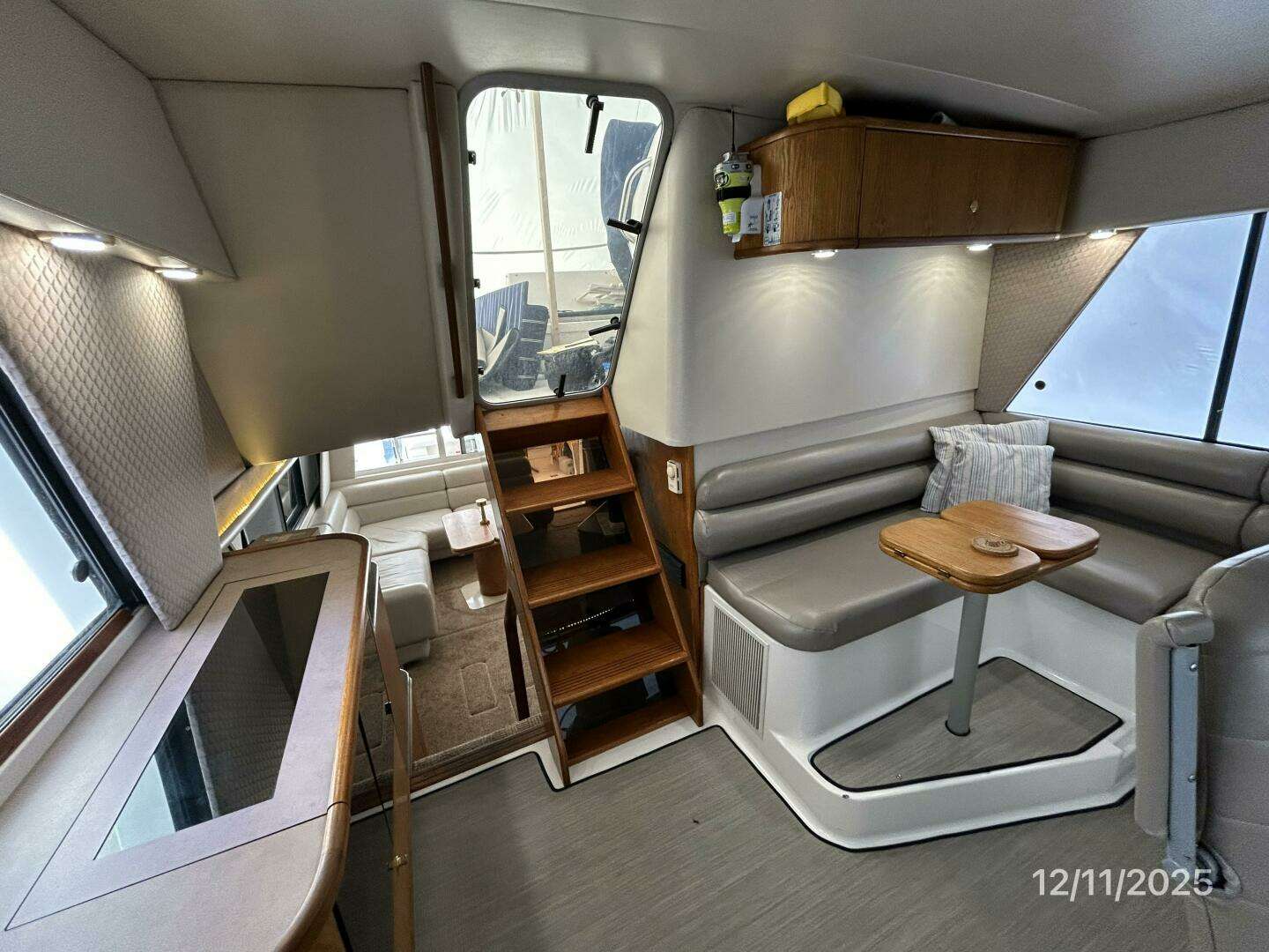 The salon offers carpet, opening side windows with screens and curtains, 2 chairs and table to port, storage cabinets in the bulkhead to port, L-shaped seating with storage and a hi/lo folding wood table to starboard, wetbar with a U-Line icemaker, sink and storage starboard forward, engine room access with an additional centerline hatch and sliding aluminum & glass door to the aftdeck. Best of all, the original wetbar blender still exists!