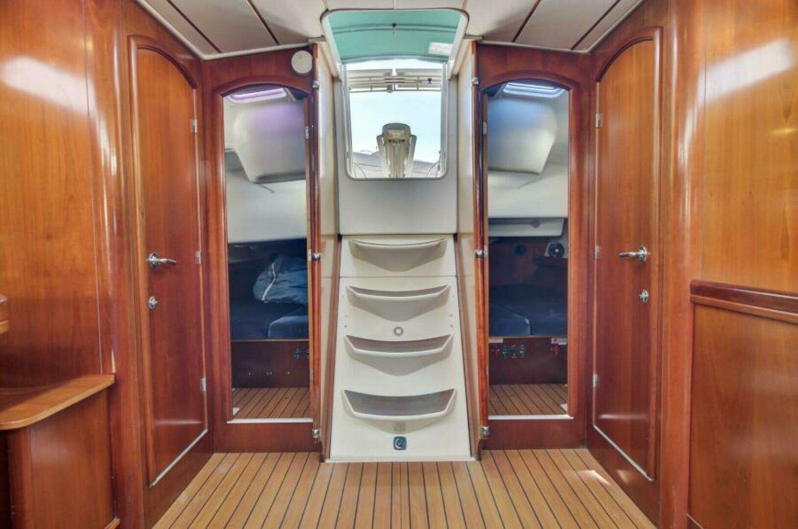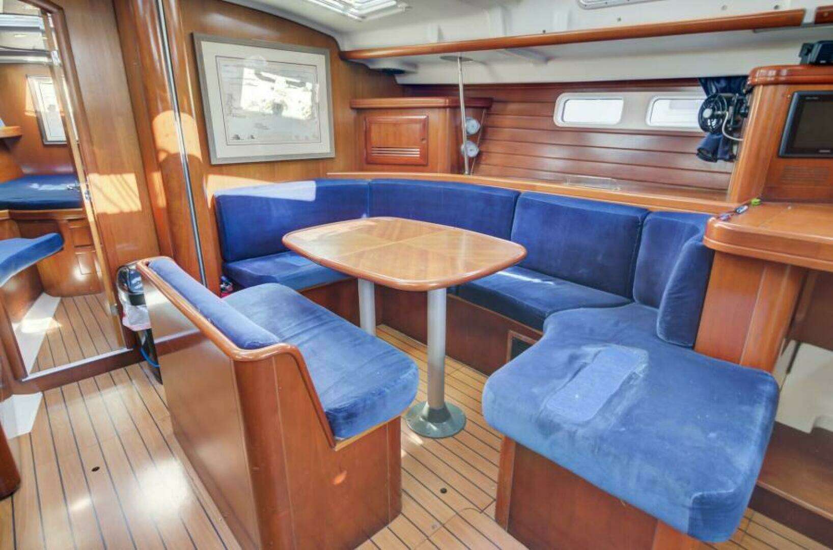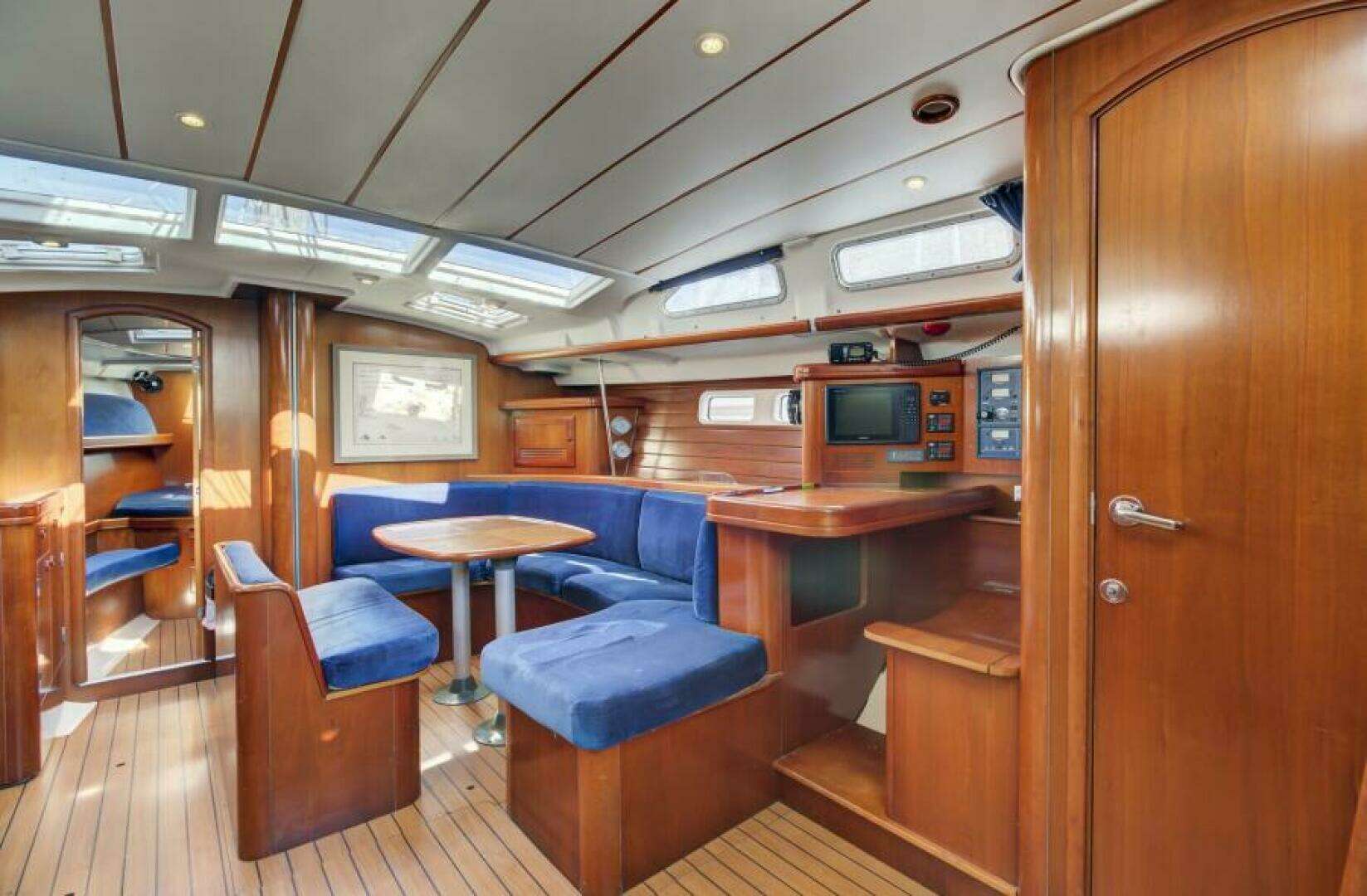 The spacious interior has a large salon with an open galley, three heads, three cabins, and a navigation station. The bright and comfortable space features attractive cherry joinery and blue upholstery. There are fixed windows, opening ports, and opening hatches throughout the space.