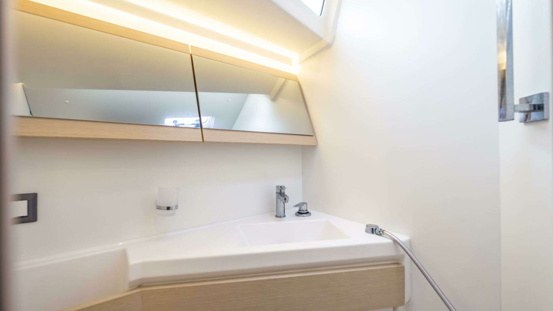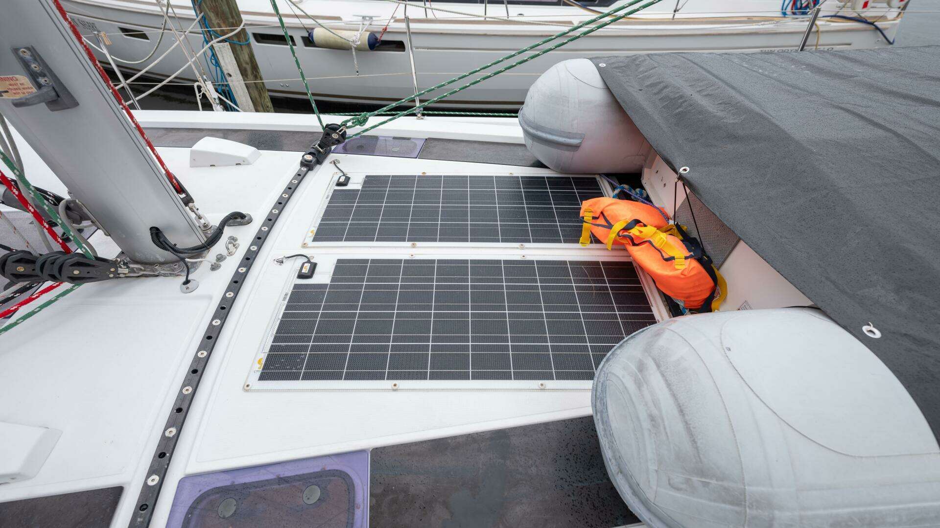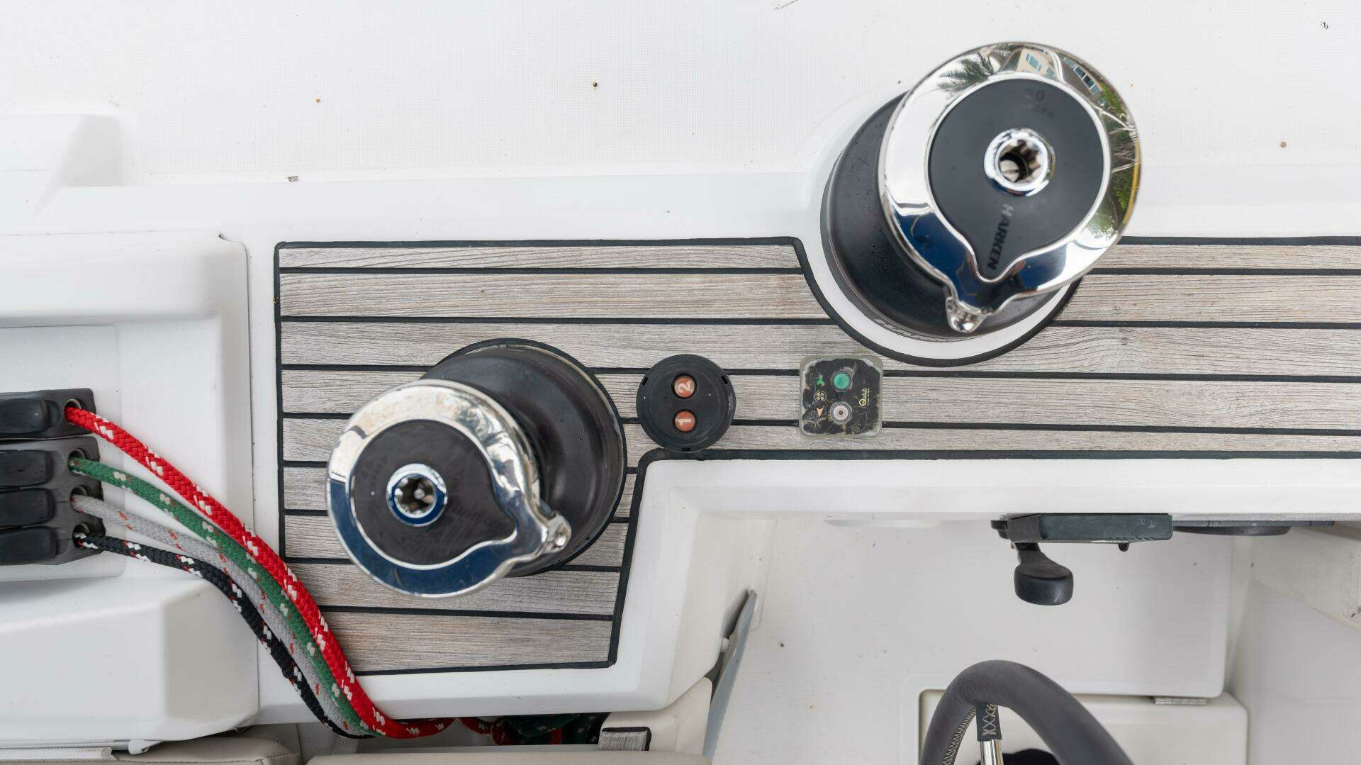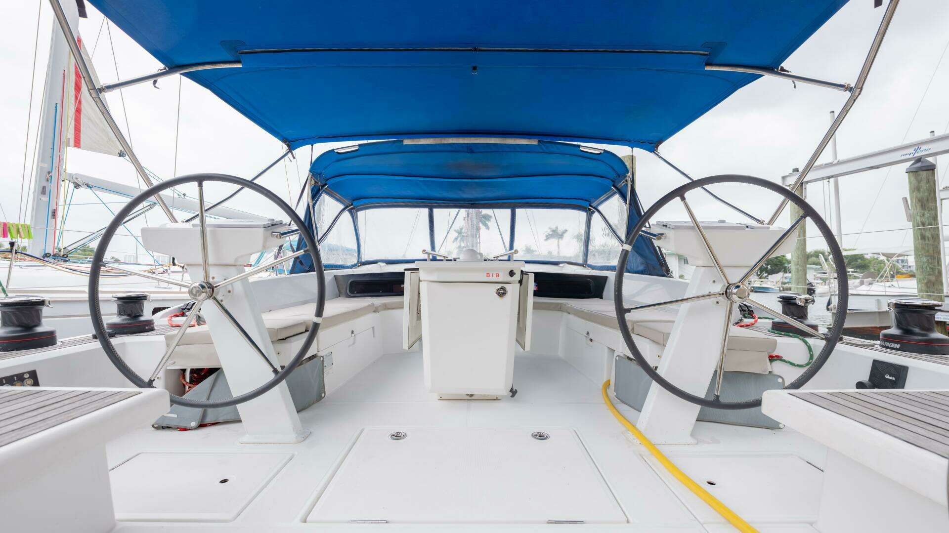 The wide beam is carried well aft, creating an expansive, secure cockpit with twin helm stations and an exceptionally efficient deck layout. Short-handed sailing is effortless thanks to a self-tacking jib, electric Harken winches, and all lines led neatly back to the helms. Twin rudders and a shallow 5'9" draft keel provide confident handling and excellent control in a wide range of conditions.