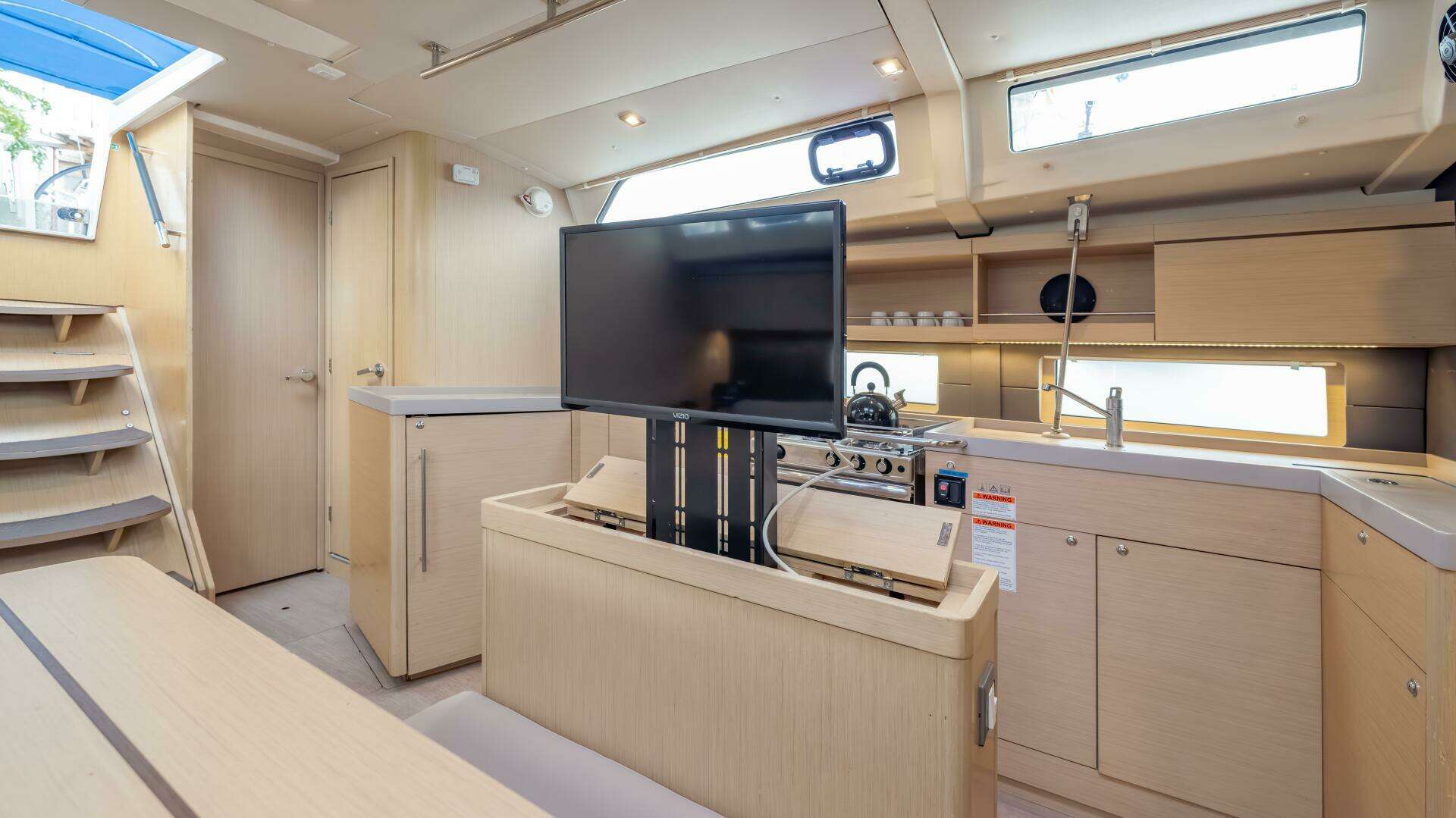 Below, the light satin oak interior is bright, modern, and inviting. Faux-leather saloon seating, three cabins with comfortable mattresses, three showers plus a transom shower, and a fully equipped galley with a three-burner cooker make this yacht ideal for extended cruising or liveaboard comfort. Every detail has been thoughtfully considered, from ample ventilation and storage to included cookware and linens.