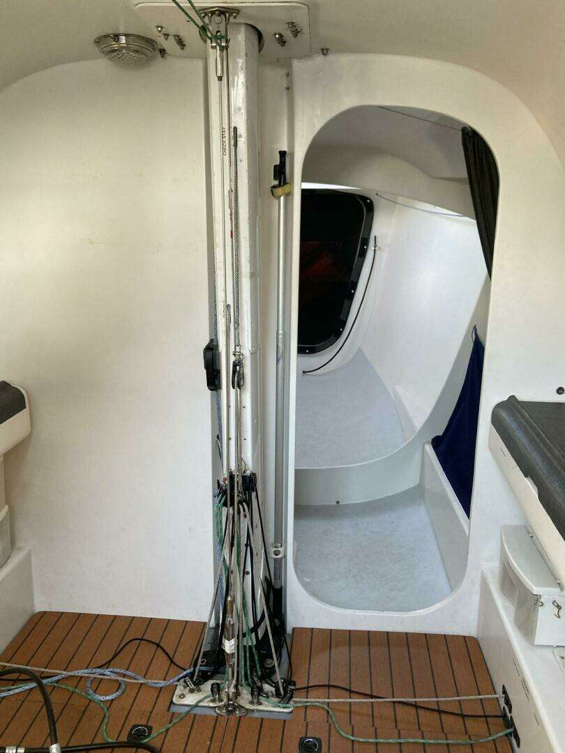 single line to deck mounted winches. Mast built by Hall Spars.