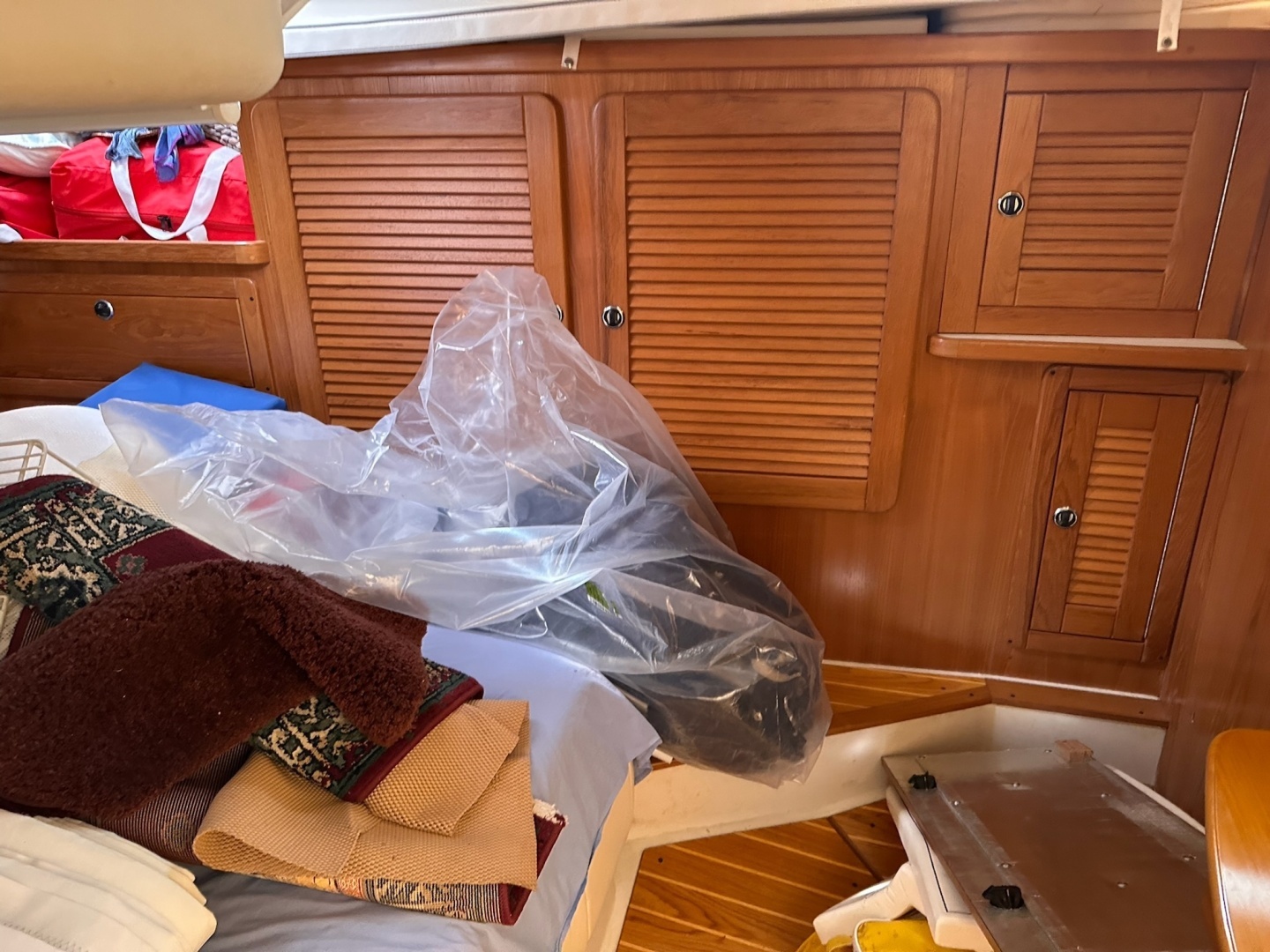 Two cabin, two head layout with owners cabin aft and forward pullman berth. Main salon with portside U shaped galley with 4 burner propane stove and oven, refrigerator, freezer and microwave. Forward of galley is large seating area around folding dining table. Opposite dinette is settee and nav station with chart table. TV in main cabin. Head forward and aft with shower, pressure hot & cold water, holding tank, macerator, Y-valve. Washer-dryer combo unit in forward head, pipe berth in fdw cabin, swivel chair in aft cabin