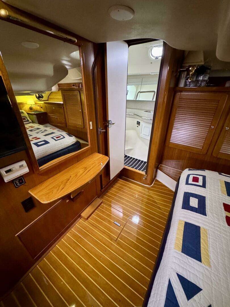 - Forward Head with stall shower, vanity and sink to starboard