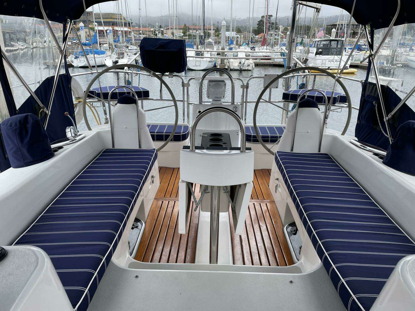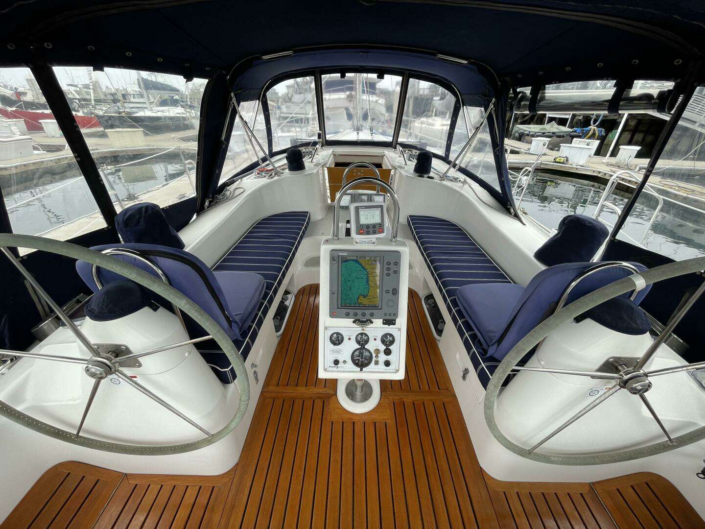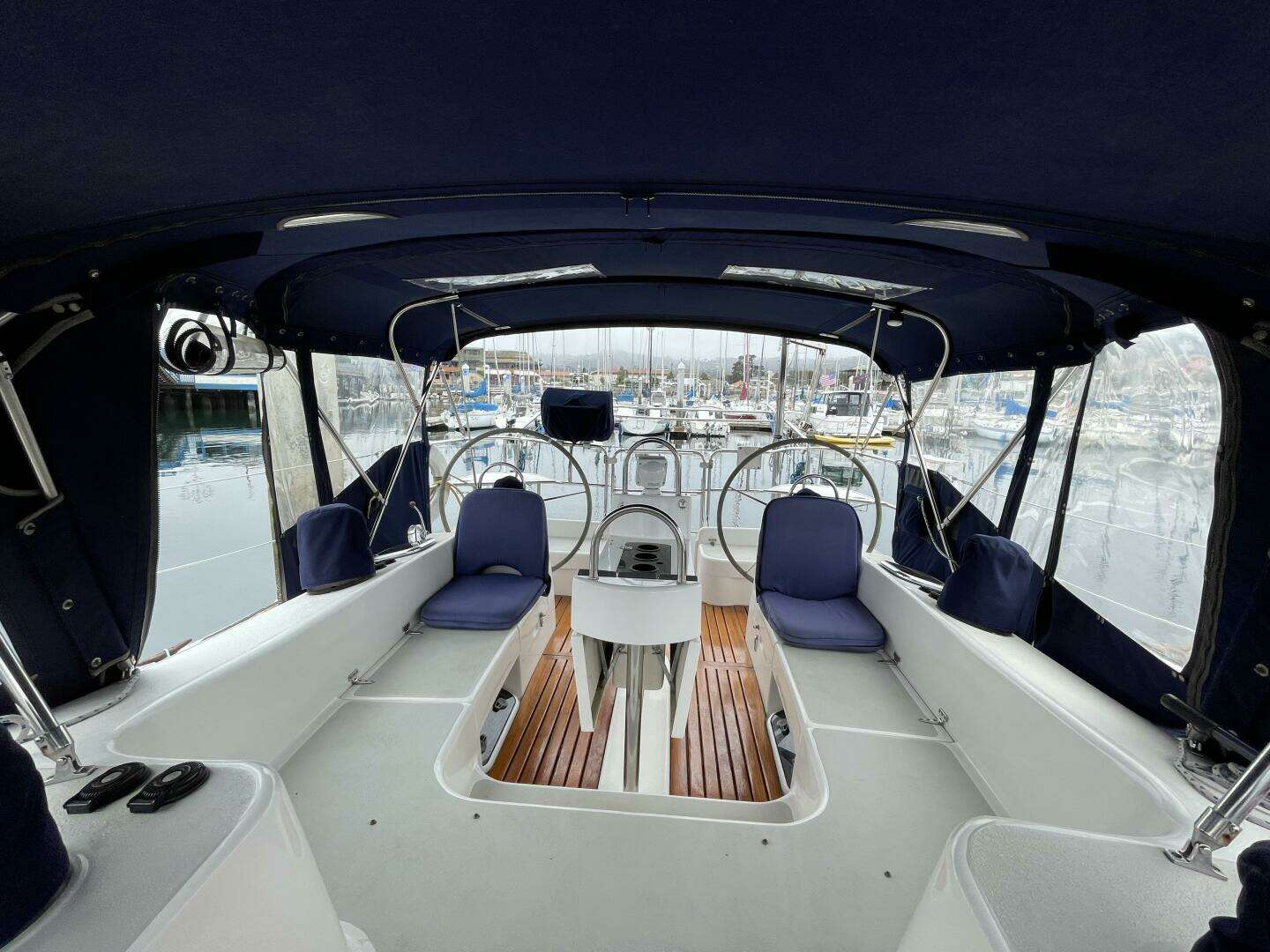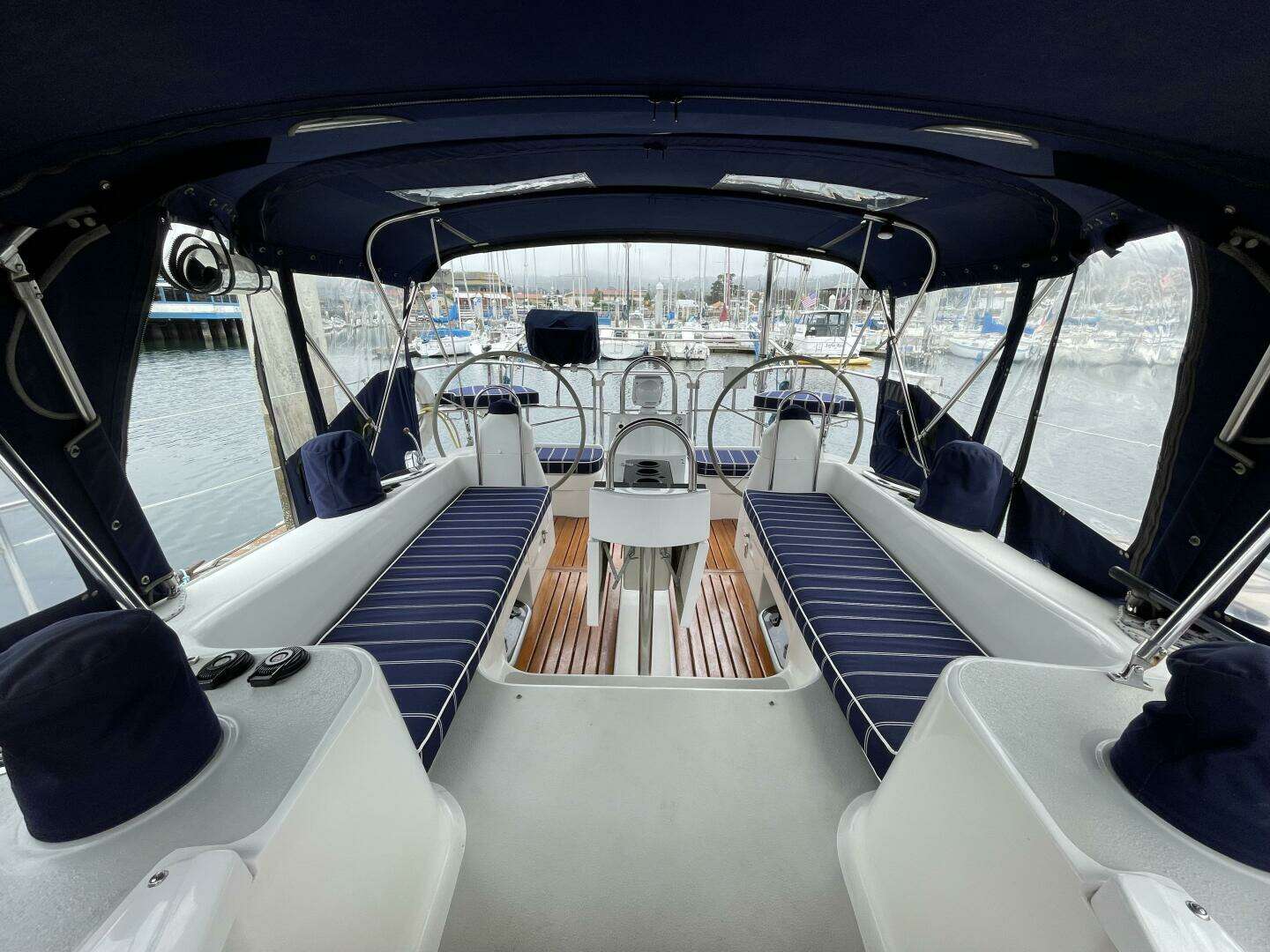 sailing yacht is loaded with many amenities, including a full canvas cockpit enclosure, dual helm stations,