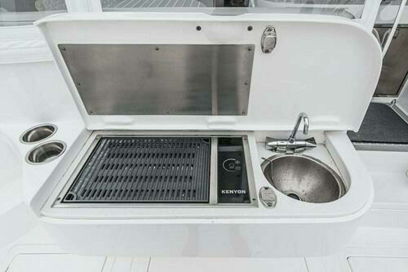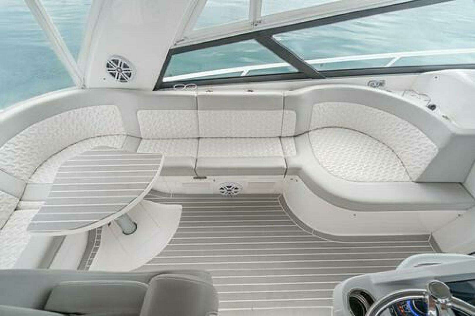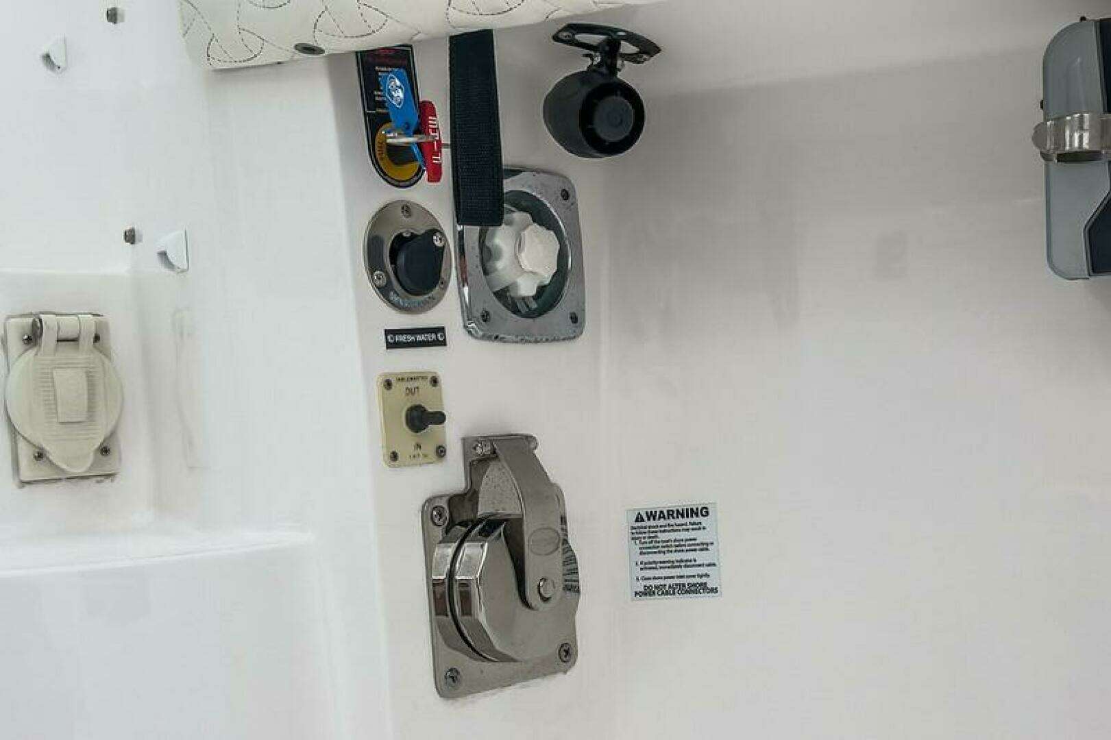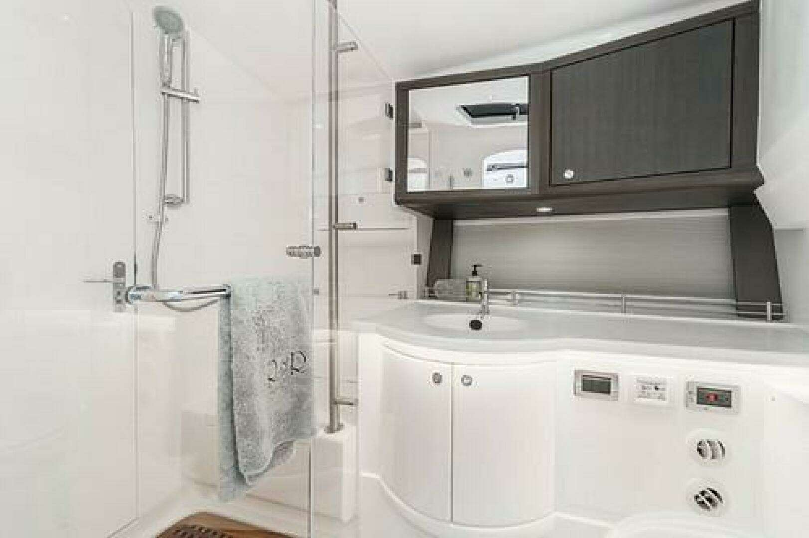 Step aboard from either the hydraulic portside swim platform or the starboard hull side door. The aft cockpit features an oversized lounge area with a hi-low electric table and a folding rear bench seat for catching some rays. Other cockpit features include a retractable electric sunshade, a wetbar, electric grill, refrigerator and icemaker. During inclement weather, everyone can stay dry inside the full insinglass enclosure while still enjoying the feeling of being outside.