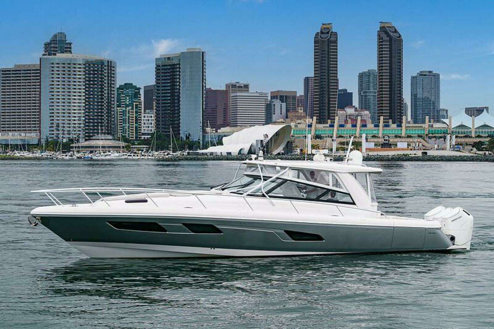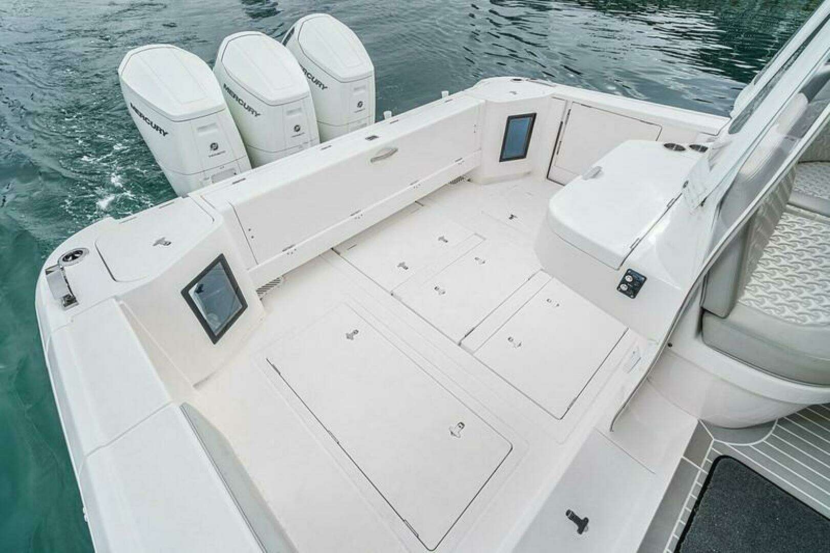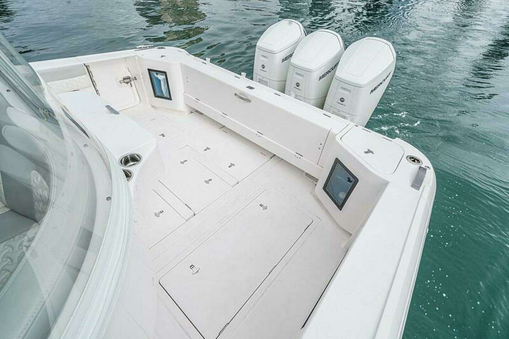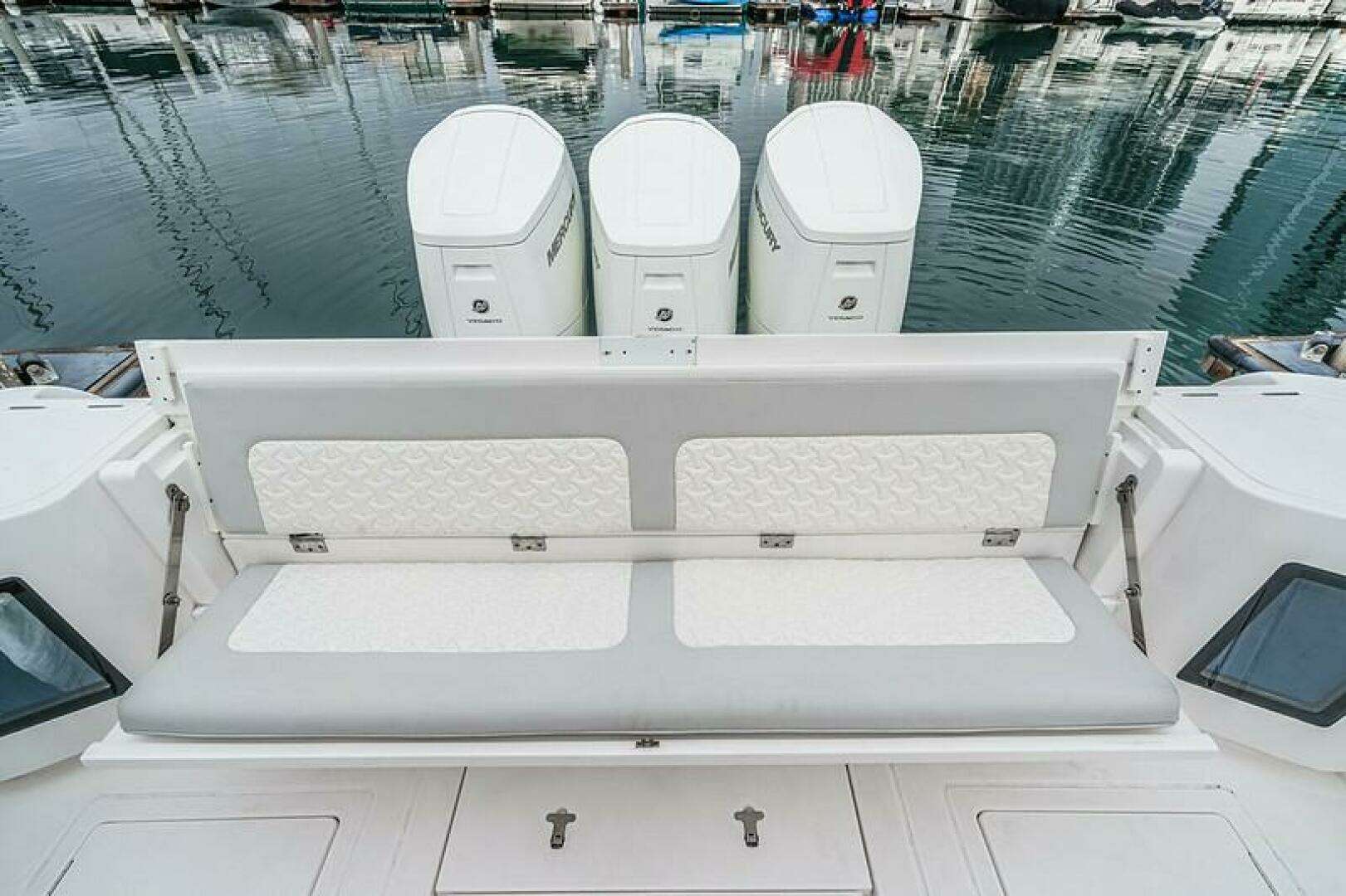 Powered by LOW HOUR Triple Mercury 600 V12 outboard engines, she delivers impressive power and is capable of cruising speeds around 43 knots and a top speed approaching 59 knots. She is equipped with a Seakeeper 6 gyroscopic stabilizer for a smooth ride, especially in rough waters, and both bow & stern thrusters make maneuvering a breeze.