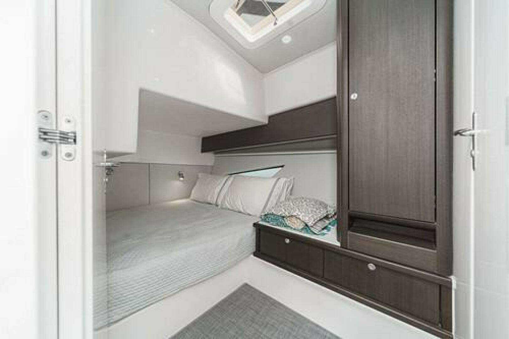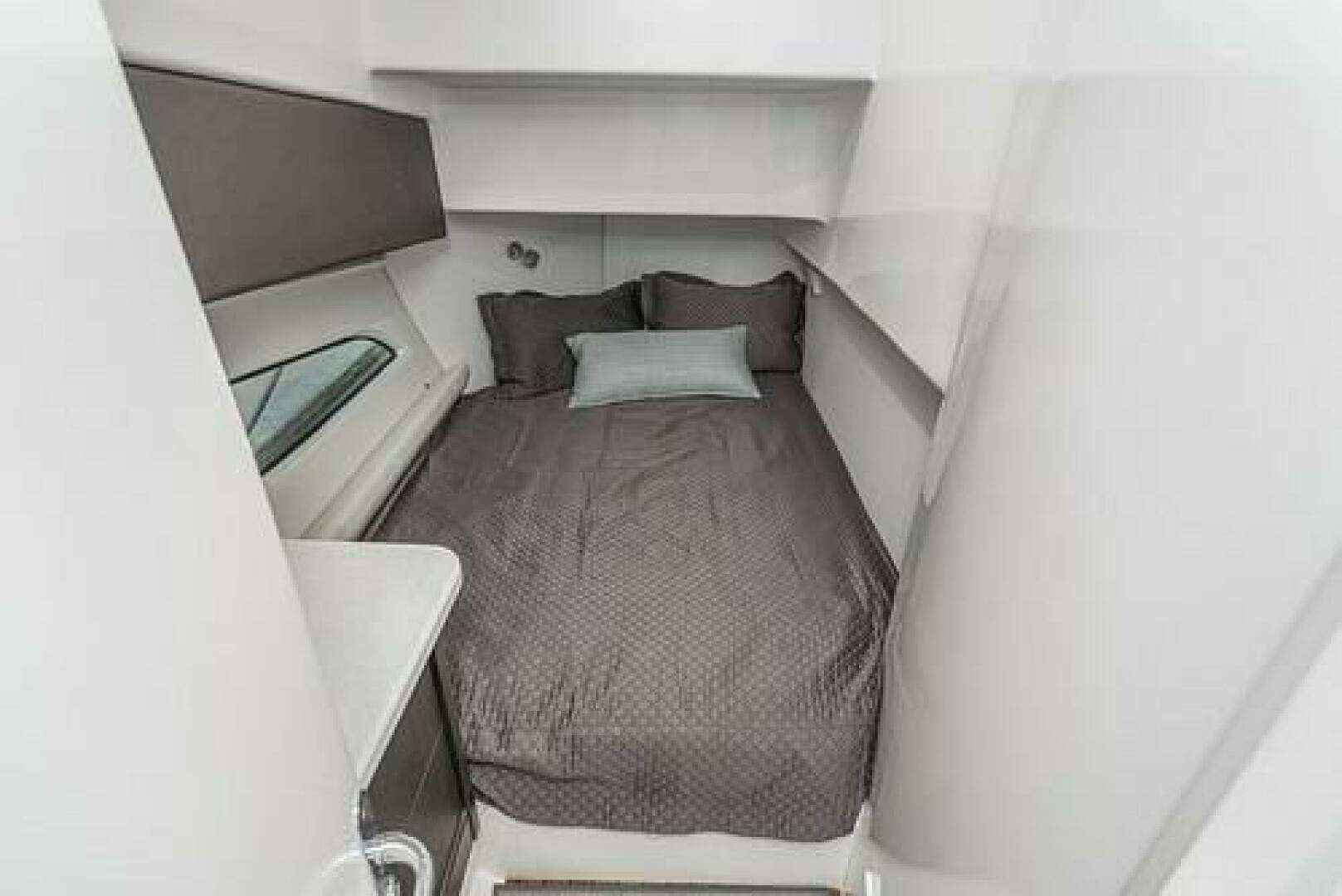 Below deck, the cabin is appointed with luxurious wood veneered cabinetry, wood flooring, and recessed LED lighting. The layout includes two private staterooms with custom bedding and a convertible V-berth, offering sleeping arrangements for up to six guests. There is a large private head compartment with a separate stall shower and a galley area featuring a sink, two-burner cooktop, microwave, and side-by-side refrigerator/freezer.