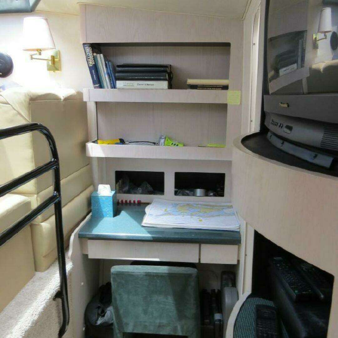 - Salon has dinette to port, galley to starboard, settees port and starboard forward and steps down to office area.