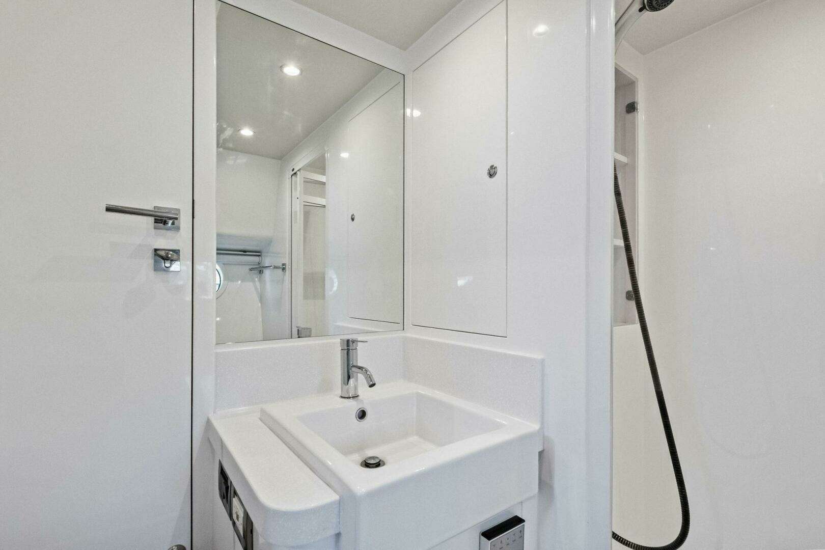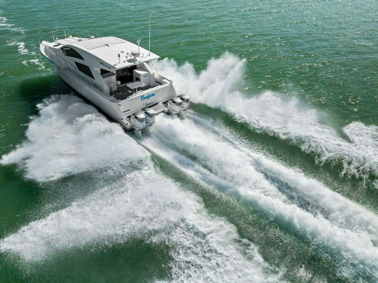 The 2018 Mares 47 Outboard Express Catamaran delivers an impressive blend of performance, efficiency, and luxury. Powered by quad Suzuki DF350A duoprop outboards, this foil-assisted power cat reaches 50+ knots and cruises comfortably in the high-30-knot range, with the hydrofoil creating lift for a smoother, more efficient ride through chop.