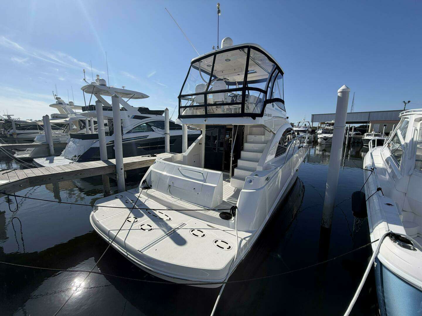 This 47 Sedan Bridge presents well—her dock profile is clean, and she’s equipped with features that make her one of the best-equipped 47s available.