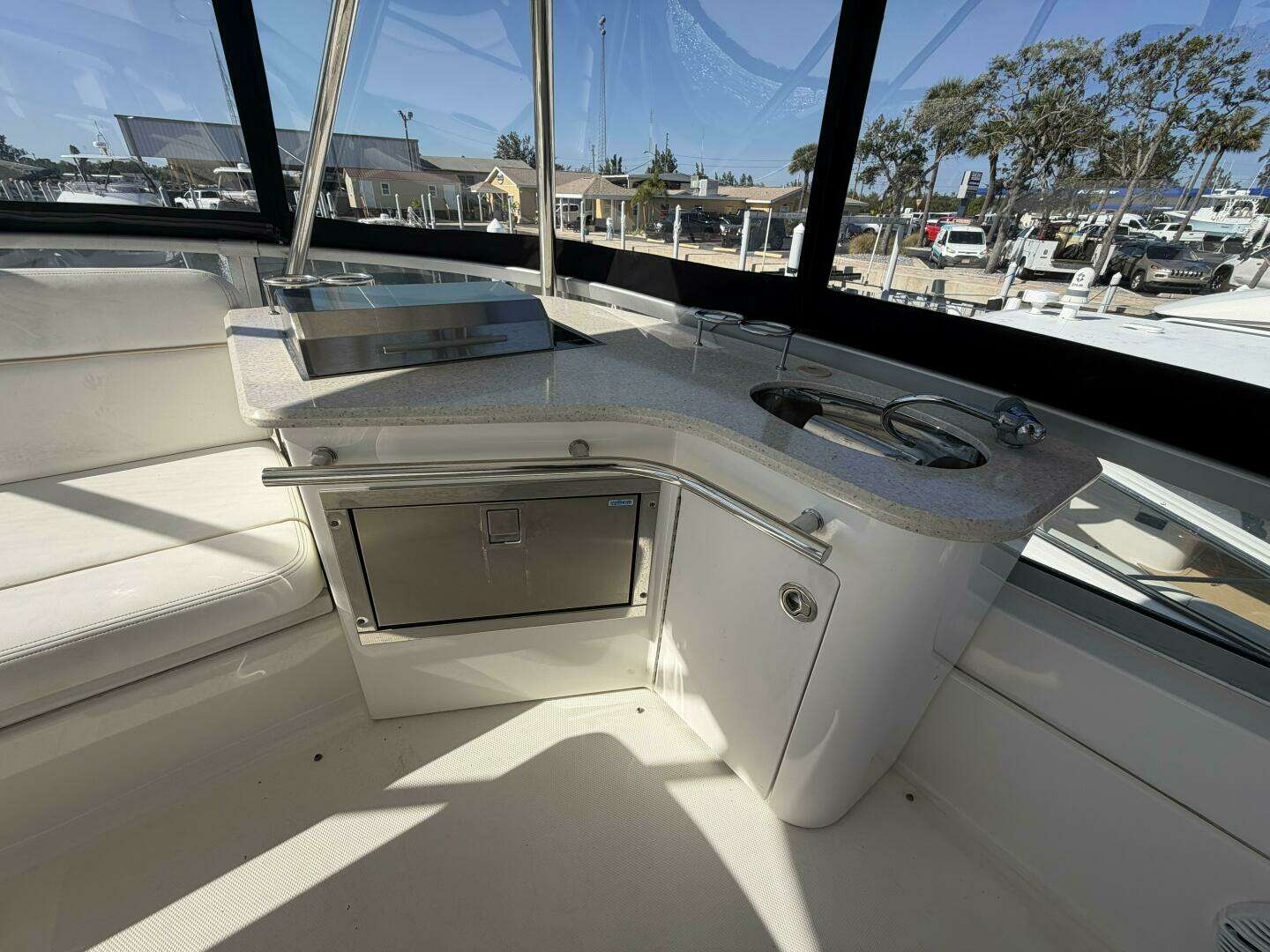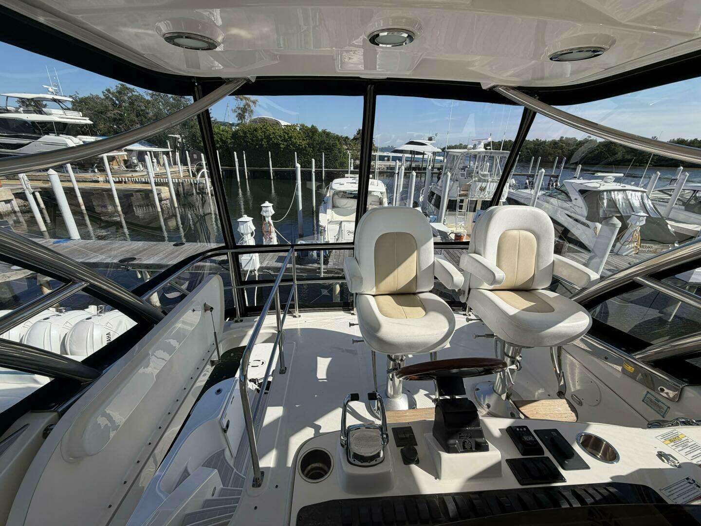 Up on the flybridge, wide molded steps lead to a spacious layout with the helm aft and lounge seating forward. The bridge features AC/heat, updated Garmin 8612 multifunction displays, upgraded Garmin autopilot, Raymarine radar, bow and stern thrusters, and a Strataglass enclosure. A fiberglass hardtop and a hydraulic swim platform were also outfitted.