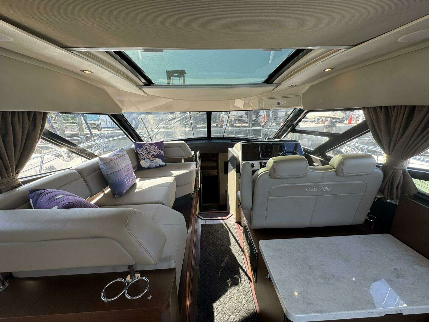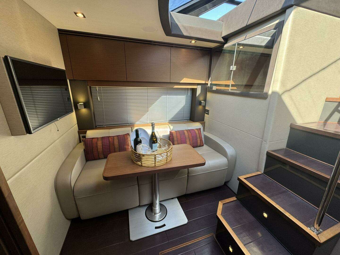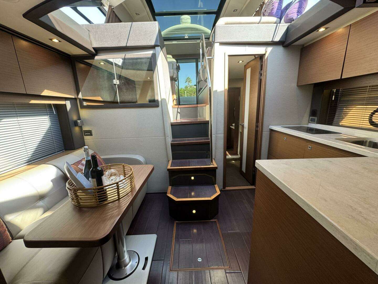 Notable equipment includes a hydraulic swim platform, DSS SAT TV, cockpit grill, aft cockpit sunshade, and manual sunroof sunshades. The vessel features a well-maintained galley, organized storage throughout, and a layout that provides a seamless indoor/outdoor transition. The climate-controlled cockpit with electric sunroof enhances comfort, ventilation, and natural light across the main deck and cabin.