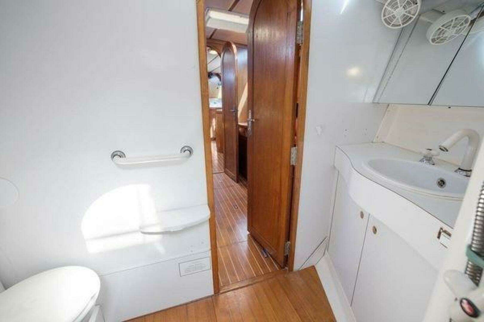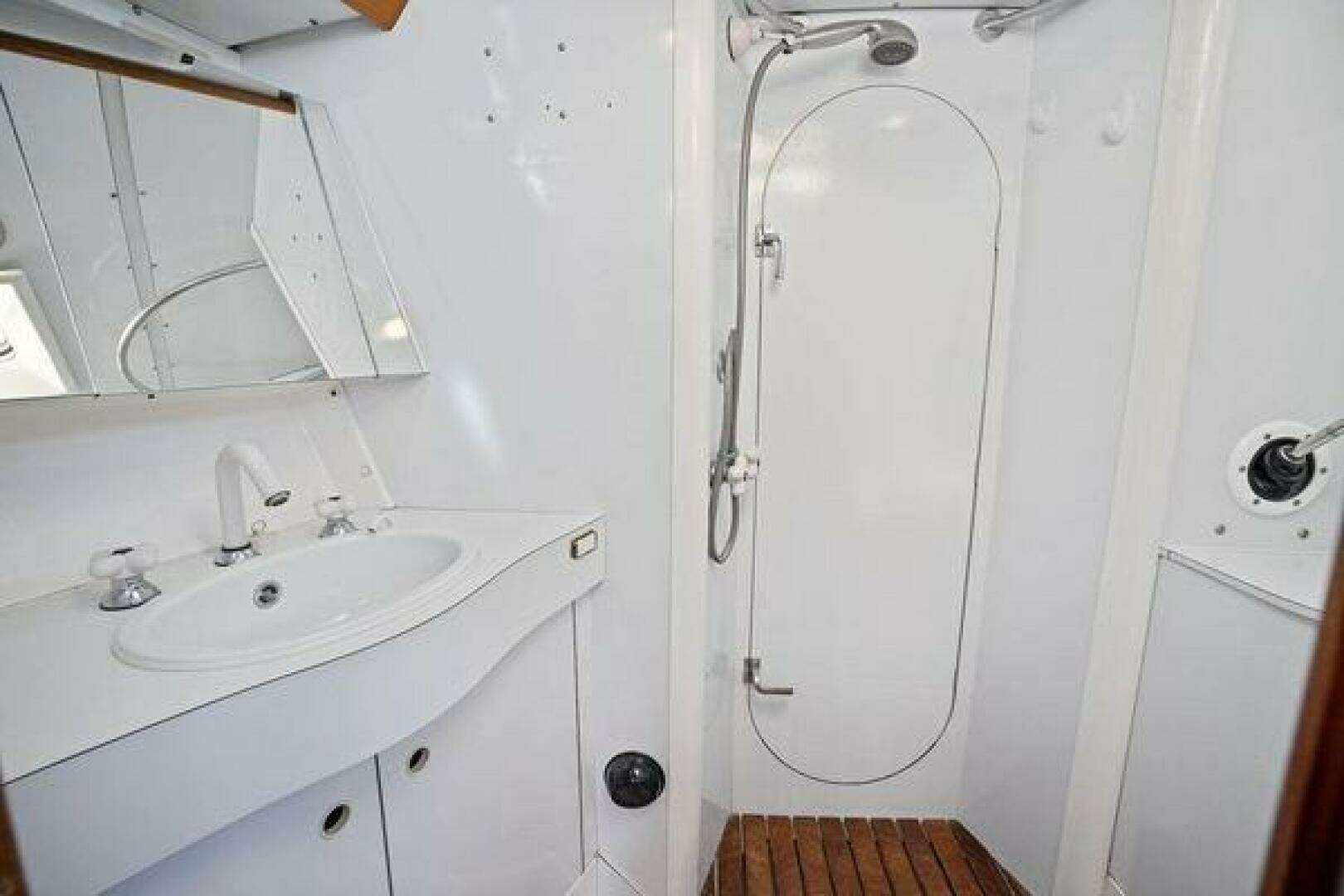 As you enter the cabin from a bridge deck in front of the cockpit the galley is to Port with a great Nav station forward. To Starboard is a large fixed dining table and storage for goodies and a large refrigerator installed at chest level. On either side of the companionway ladder are quarter berth areas, one with a queen berth the other with stacked sea berths. A head connects the two cabins aft of the companionway. Forward of the main bulkhead is the owners stateroom with a settee to port and a Pullman queen bed to Starboard. All cabins are lined with teak paneling and teak cabinetry which gives Gazelle a very comfortable feeling. Forward of the owners stateroom is a large head compartment with a standup shower and forward from there is a sail locker/ workspace with a huge sliding hatch overhead. The floorboards are teak and holly laminates, still in good condition. This boat shows it's age gracefully and was built to last.