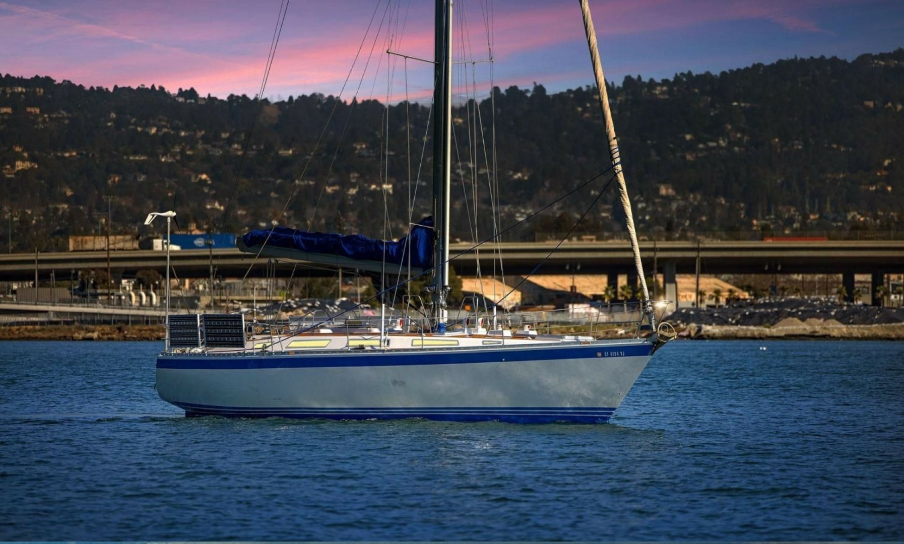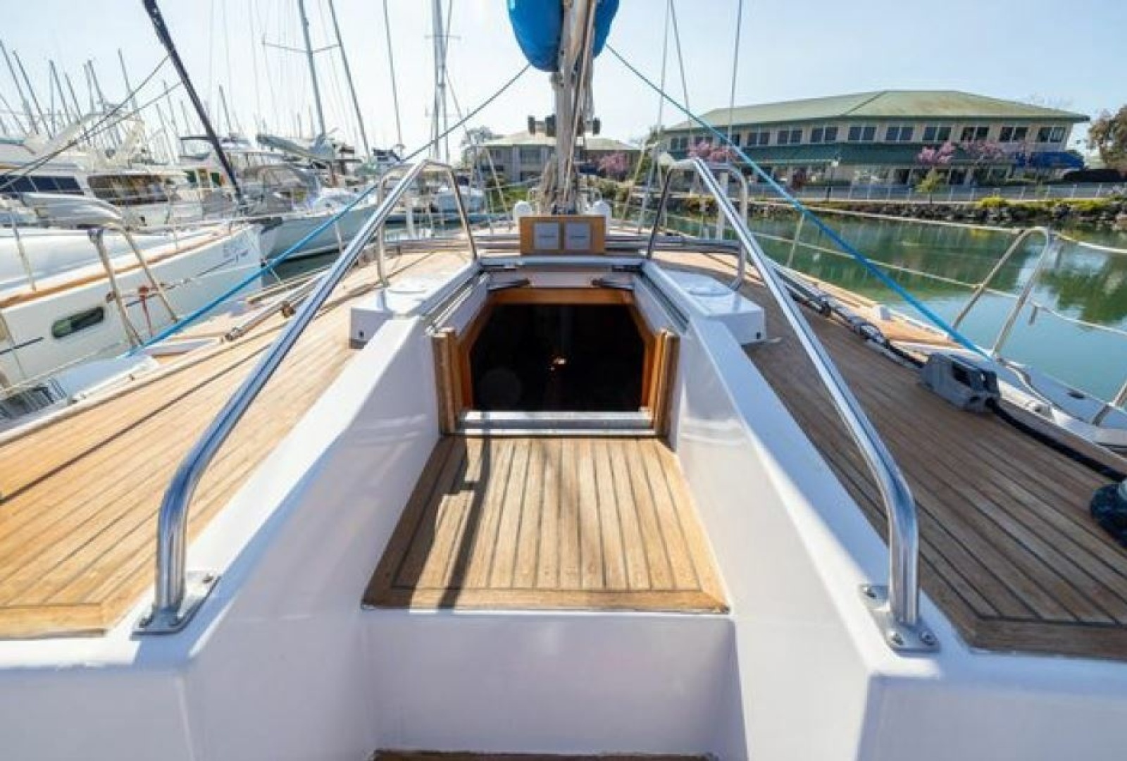 The well maintained teak deck features a no nonsense layout with a safe deep cockpit and well positioned gear. There'sa dodger with canvas and hoops for Bimini and plenty of handholds for getting about. With lazyjacks and jiffy reefing,handling the Vectran mainsail is a snap. Gazelle is a handsome boat that looks good under sail and at anchor and withher shallow draft you'll be able to get into places only smaller boats can venture into.