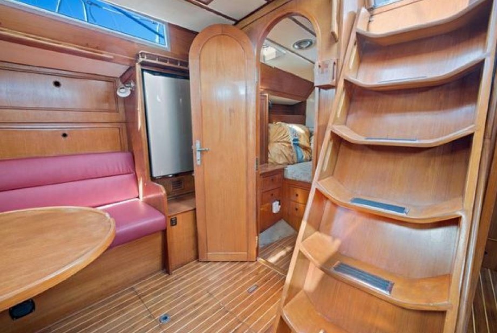 As you enter the cabin from a bridge deck in front of the cockpit the galley is to Port with a great Nav station forward. ToStarboard is a large fixed dining table and storage for goodies and a large refrigerator installed at chest level. On eitherside of the companionway ladder are quarter berth areas, one with a queen berth the other with stacked sea berths. Ahead connects the two cabins aft of the companionway. Forward of the main bulkhead is the owners stateroom with asettee to port and a Pullman queen bed to Starboard. All cabins are lined with teak paneling and teak cabinetry whichgives Gazelle a very comfortable feeling. Forward of the owners stateroom is a large head compartment with a standupshower and forward from there is a sail locker/ workspace with a huge sliding hatch overhead. The floorboards are teakand holly laminates, still in good condition. This boat shows it's age gracefully and was built to last.